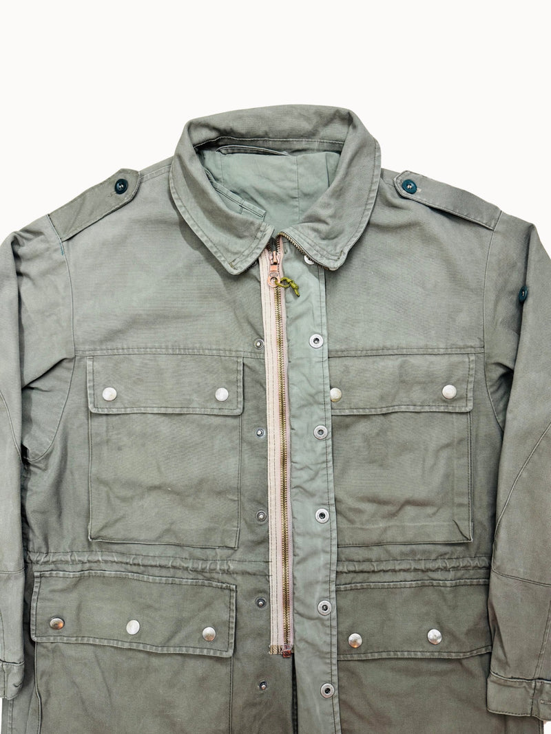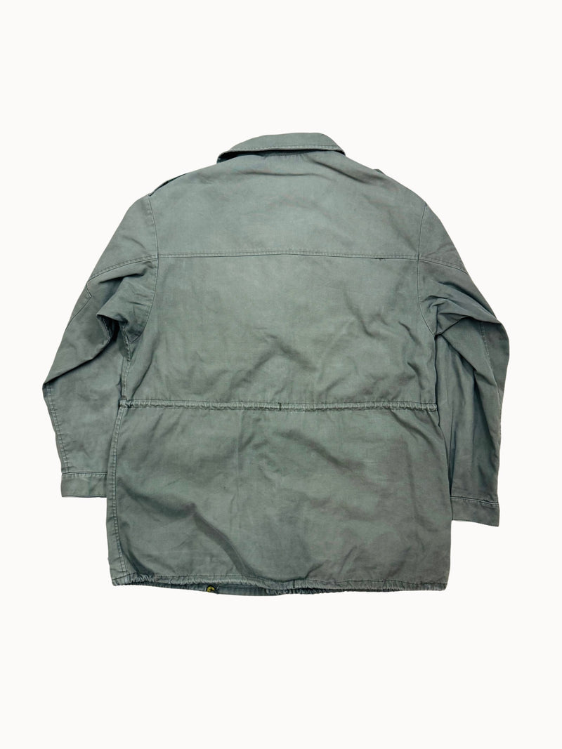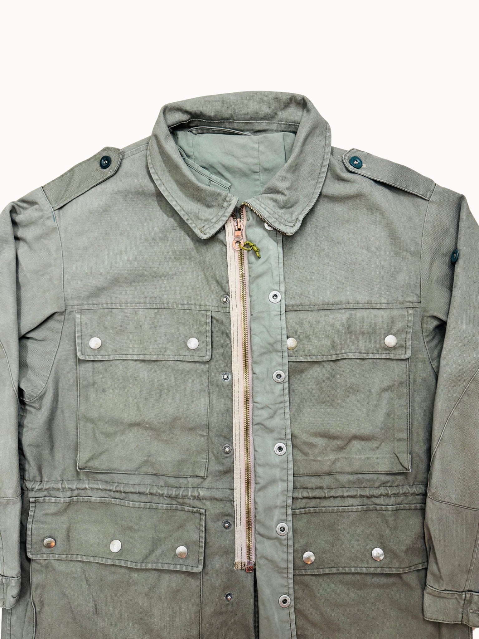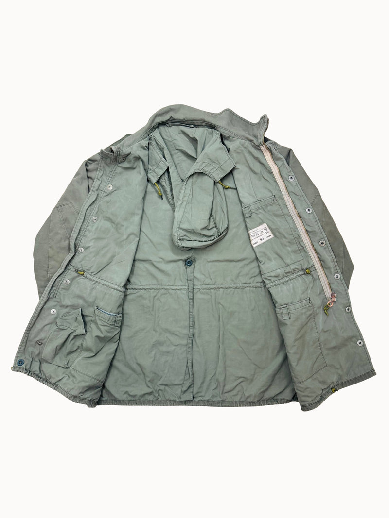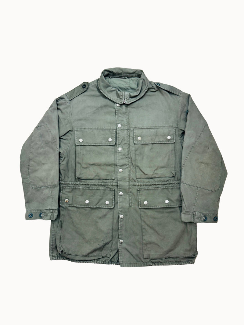 Ein authentisches Stück Schweizer Militärgeschichte. 1975 eingeführt, für die Berge gebaut und auf Langlebigkeit ausgelegt. Mit robuster Baumwollhülle, vier großzügigen Fronttaschen, integrierter Kapuze und verstärkter Verarbeitung.