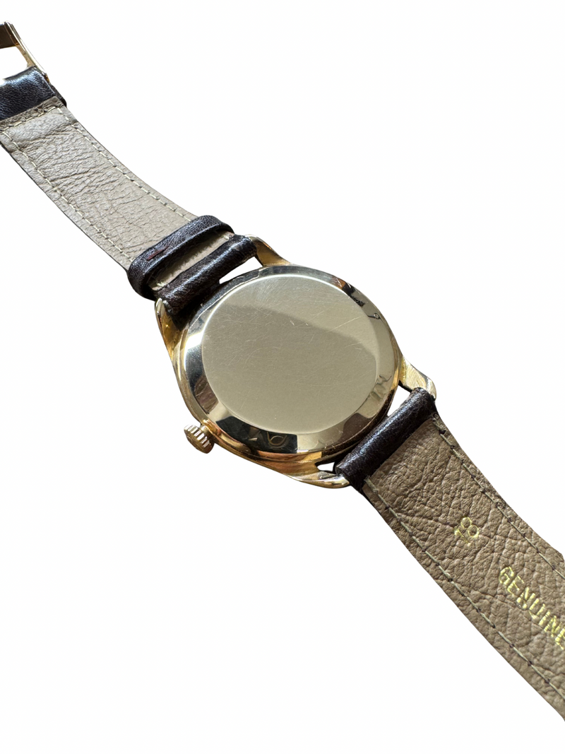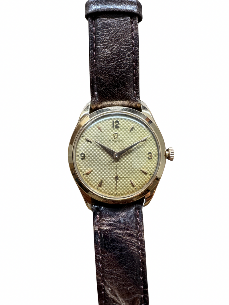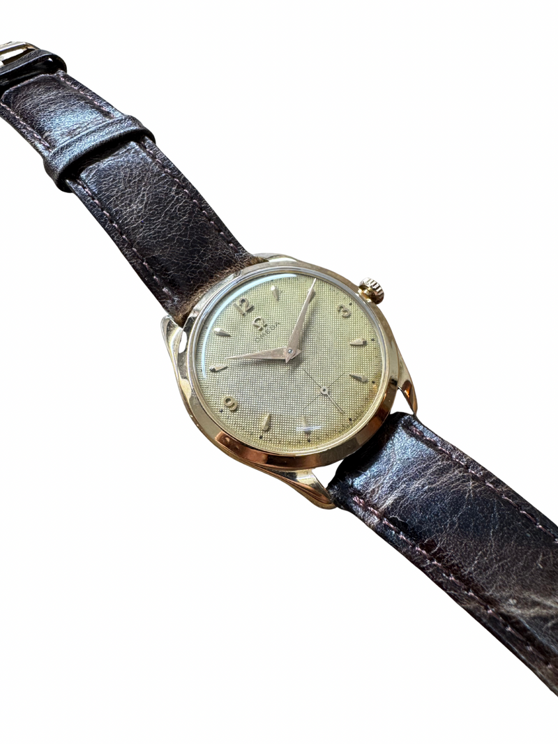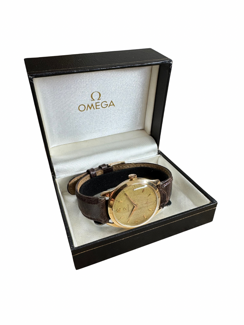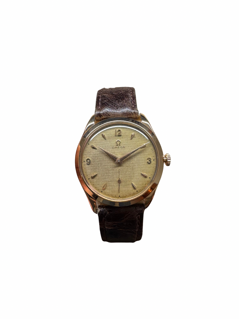 This classic Omega from the 1950s stands out with its refined 18K rose gold case and finely textured honeycomb dial — a rare and highly sought-after configuration today.