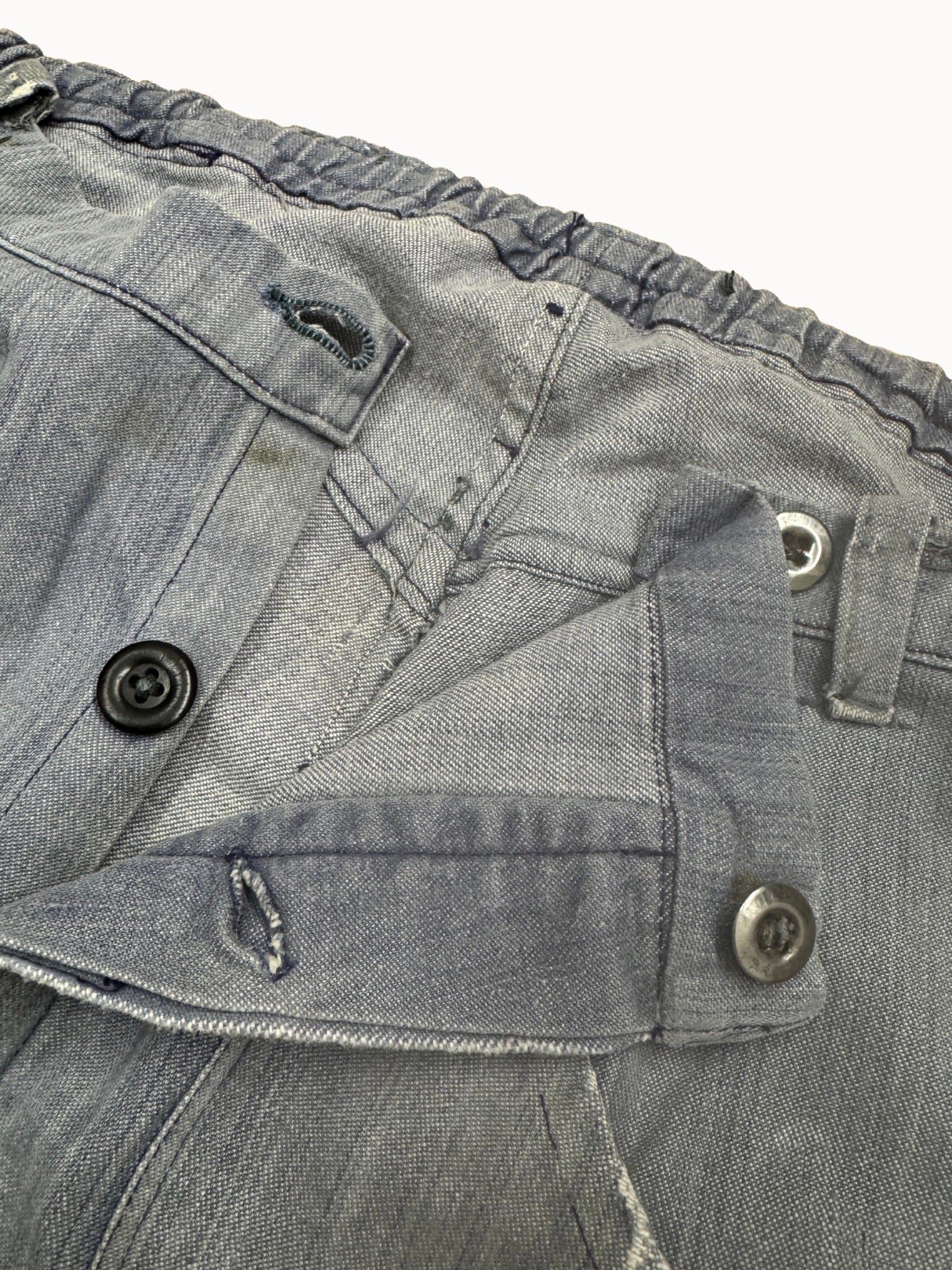 Der Schnitt: weit, gerades Bein, hoher Bund mit Knopfverschluss. Ergänzt durch Gürtelschlaufen und ein Zugband am Rücken – typische Details französischer Arbeitskleidung der 1920er/30er Jahre.