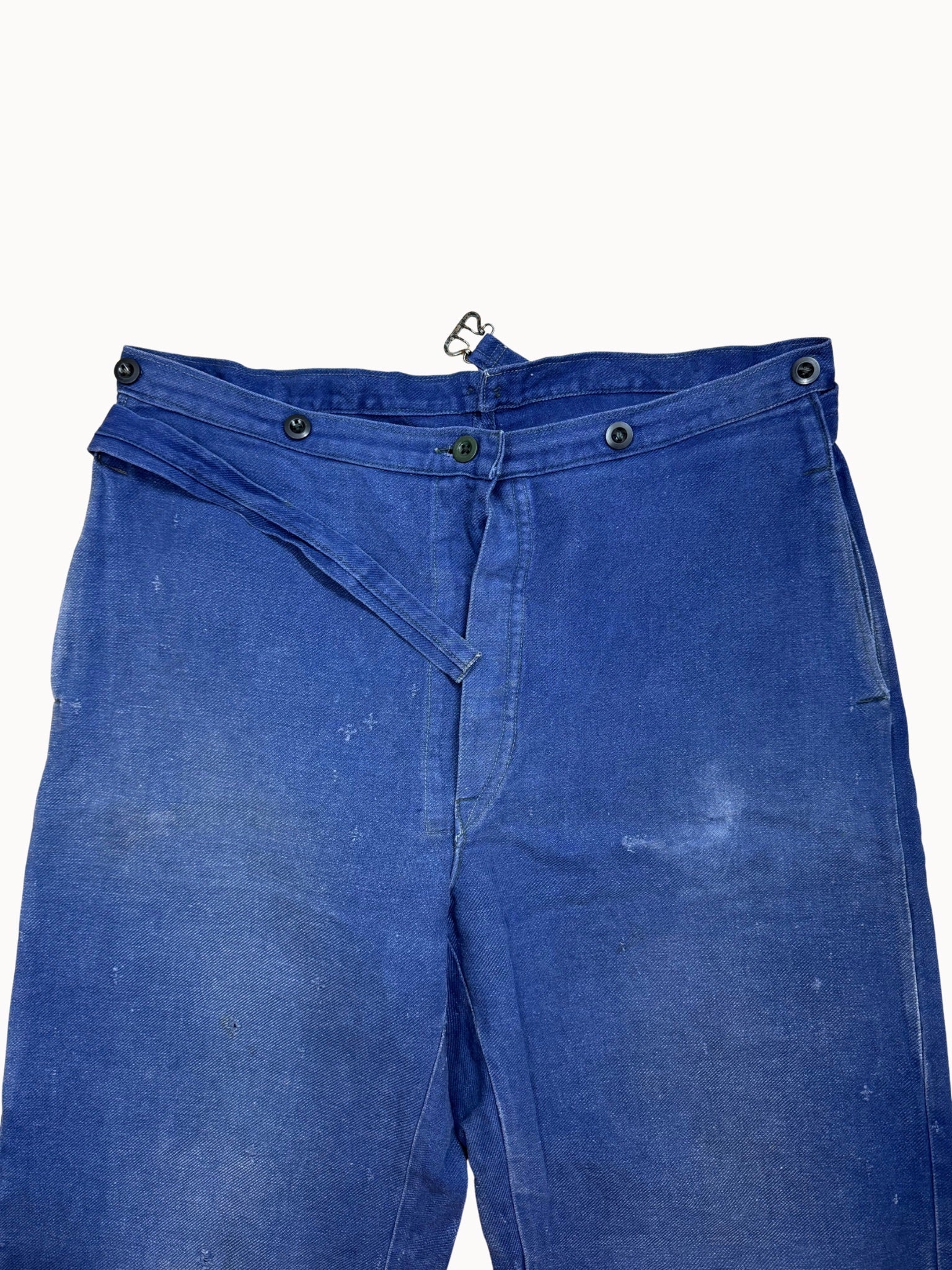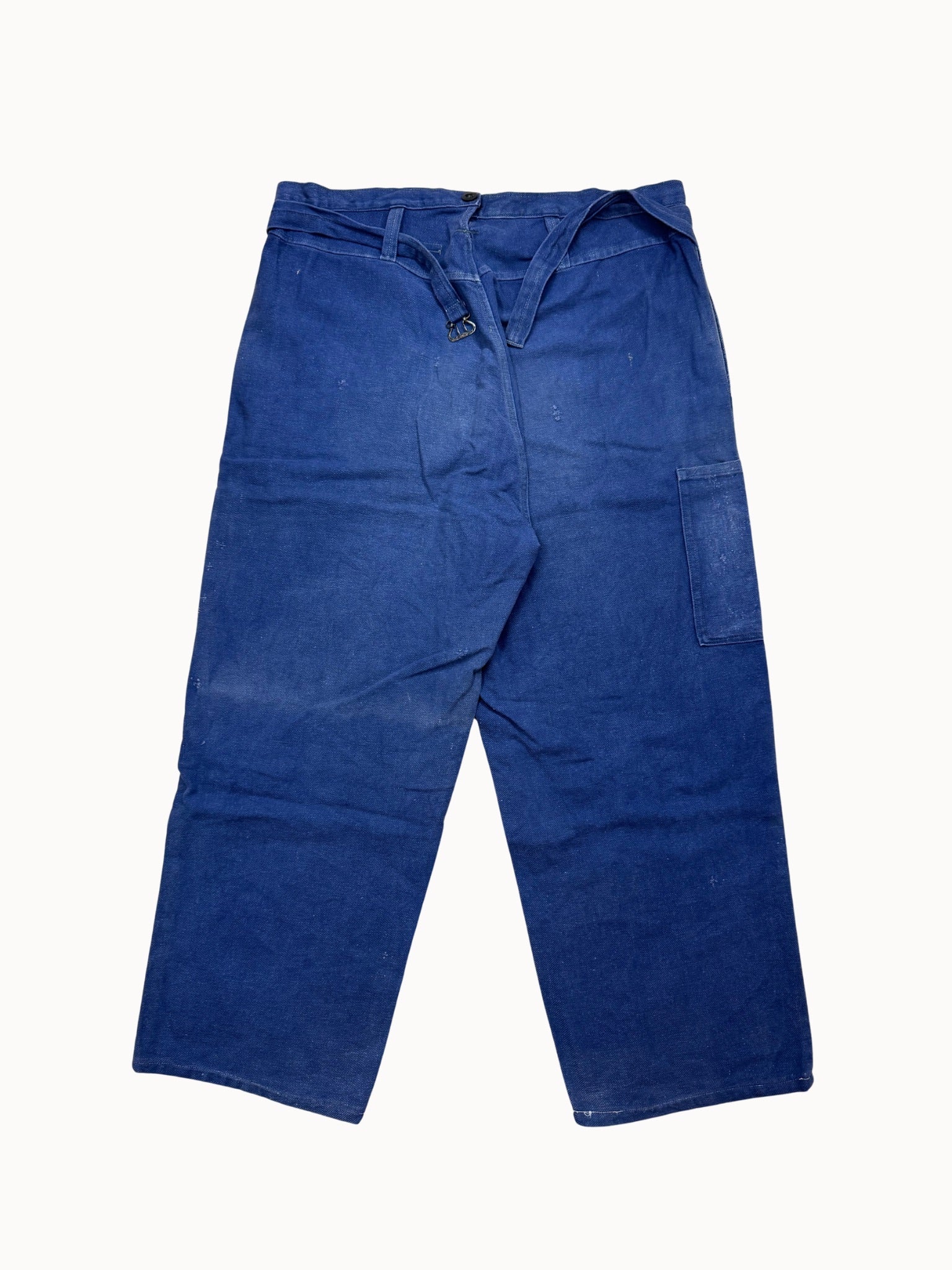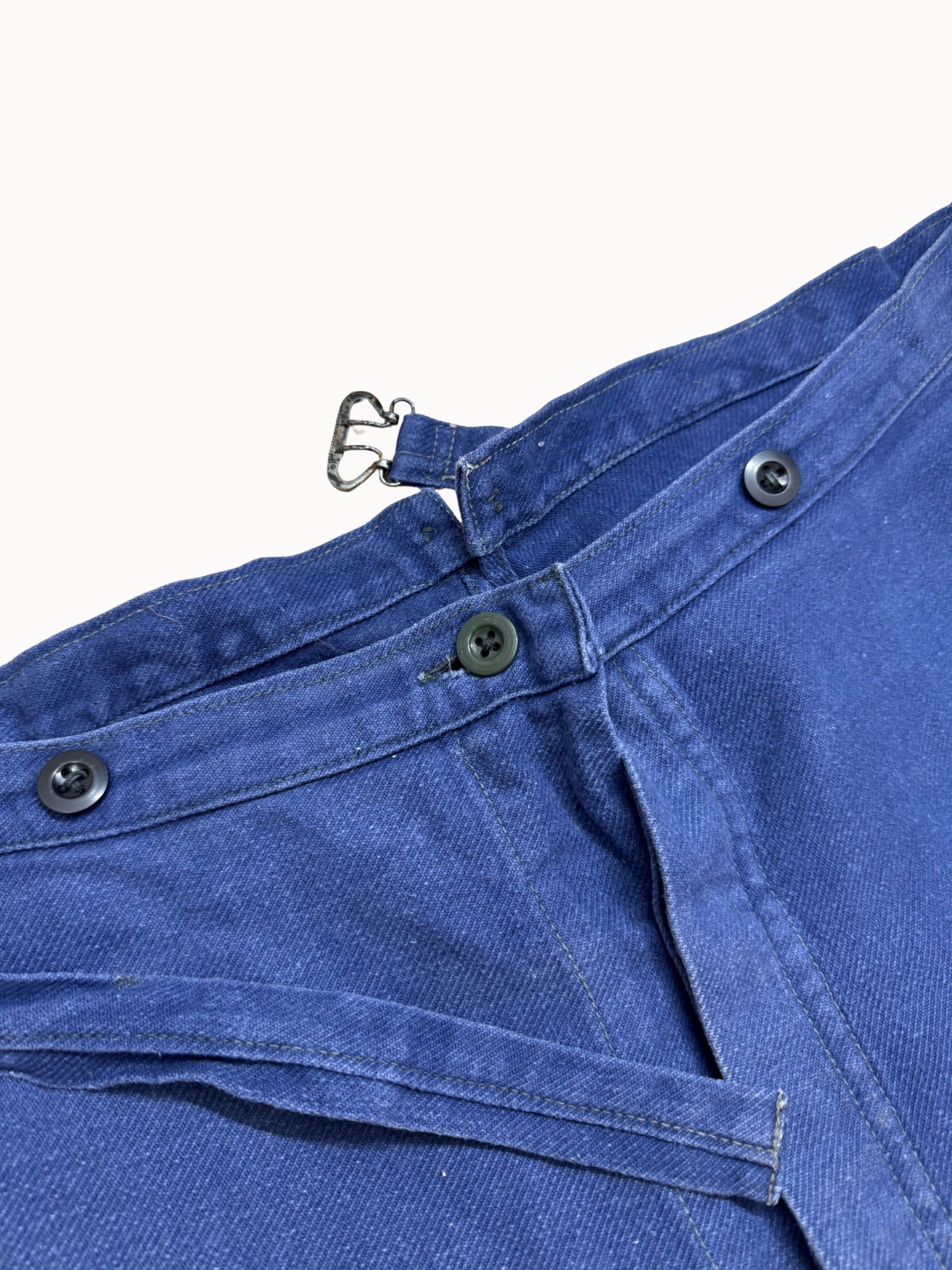 Eine klassische Arbeiterhose aus der Nachkriegszeit, gefertigt aus kräftigem Baumwoll-Twill in tiefem Kobaltblau. Dieser Farbton – bekannt als bleu de travail – prägte die Arbeitskleidung in Frankreich und der Schweiz ab den 1930er-Jahren.