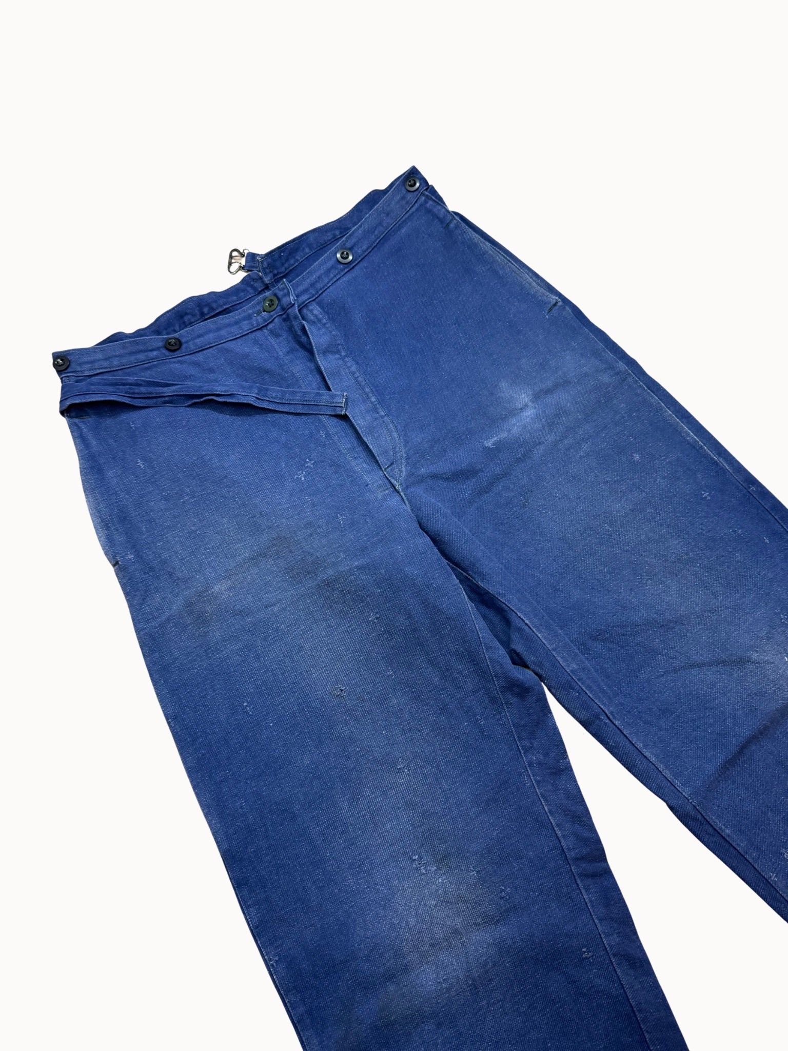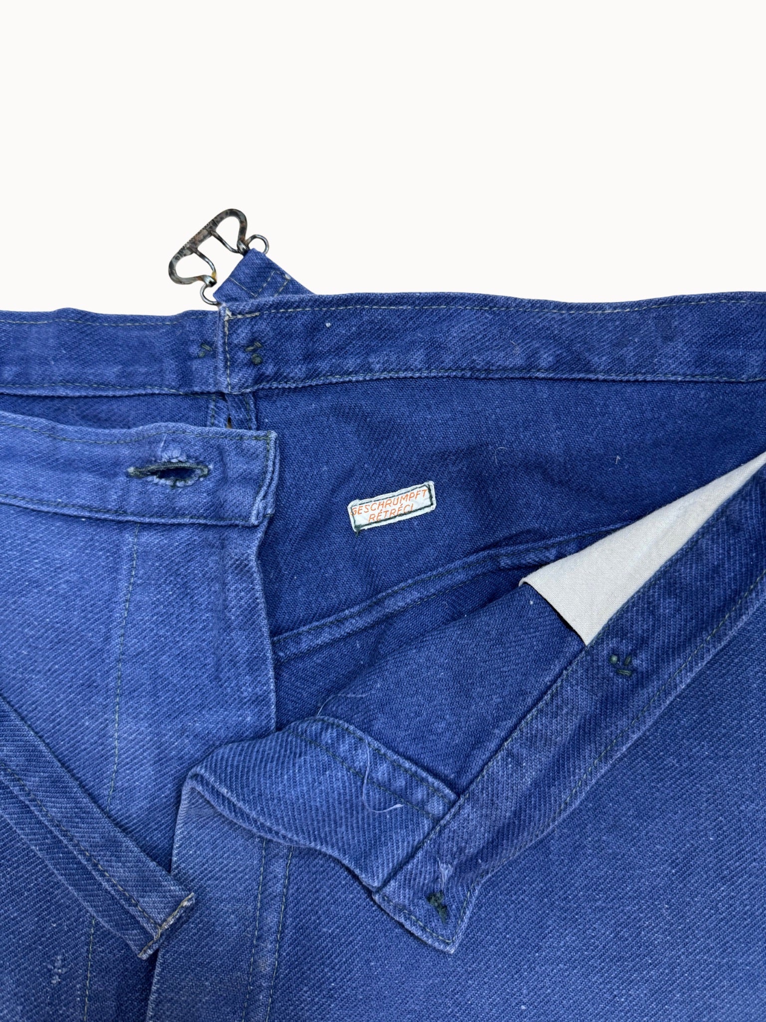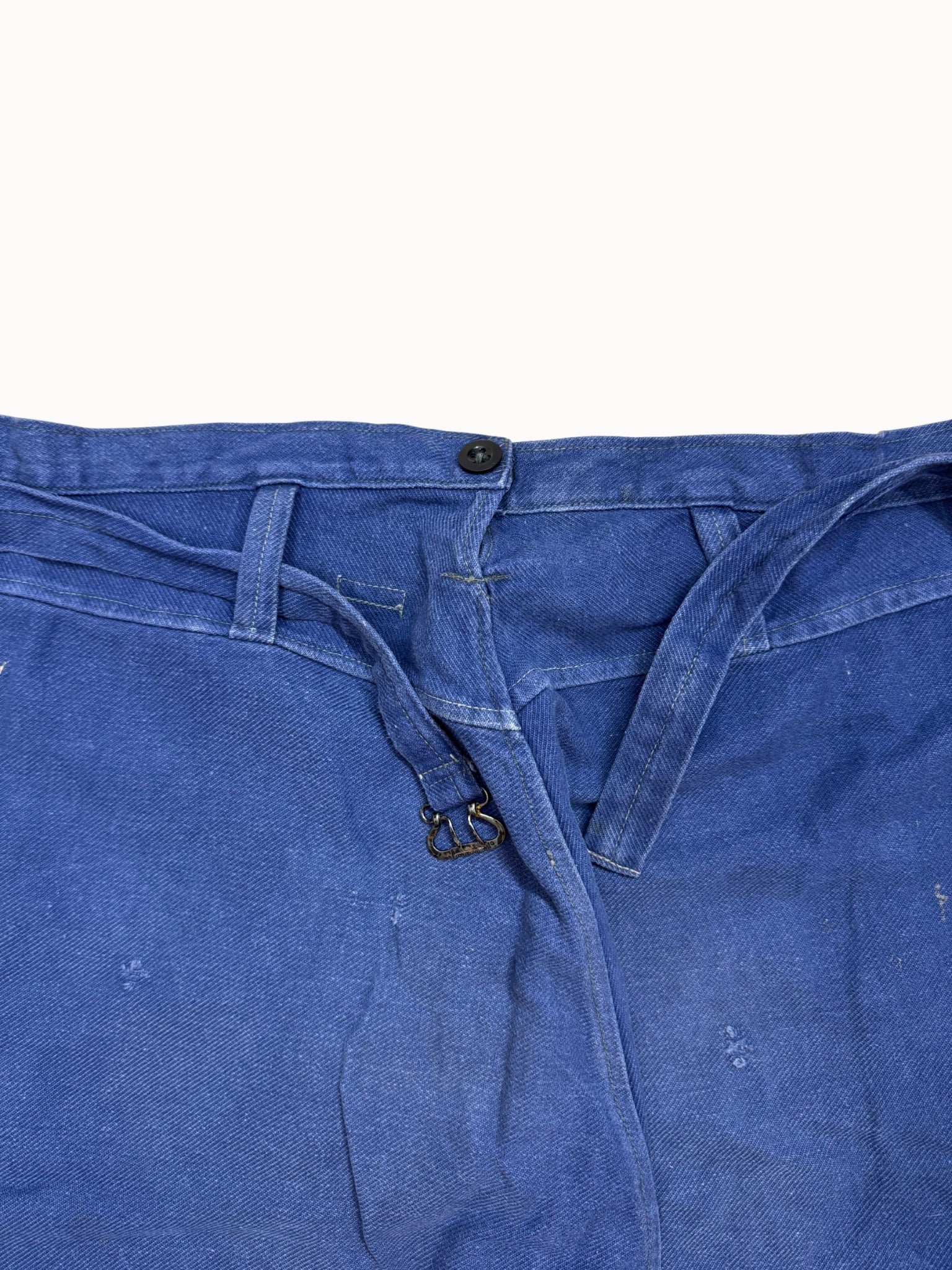 Eine klassische Arbeiterhose aus der Nachkriegszeit, gefertigt aus kräftigem Baumwoll-Twill in tiefem Kobaltblau. Dieser Farbton – bekannt als bleu de travail – prägte die Arbeitskleidung in Frankreich und der Schweiz ab den 1930er-Jahren.