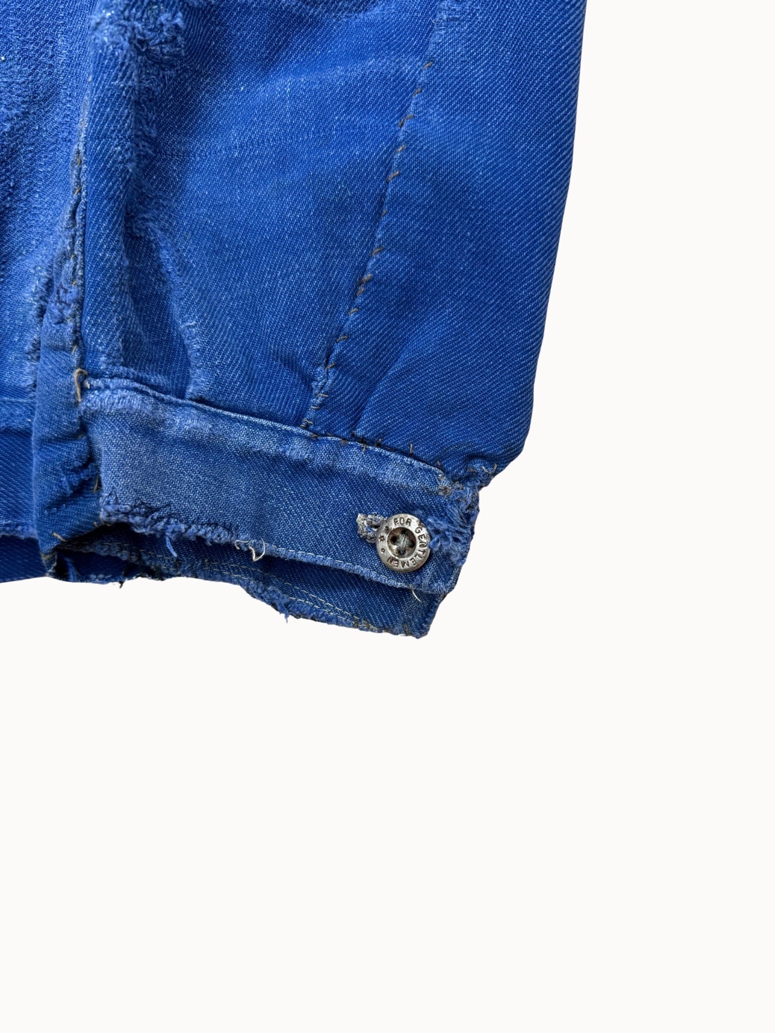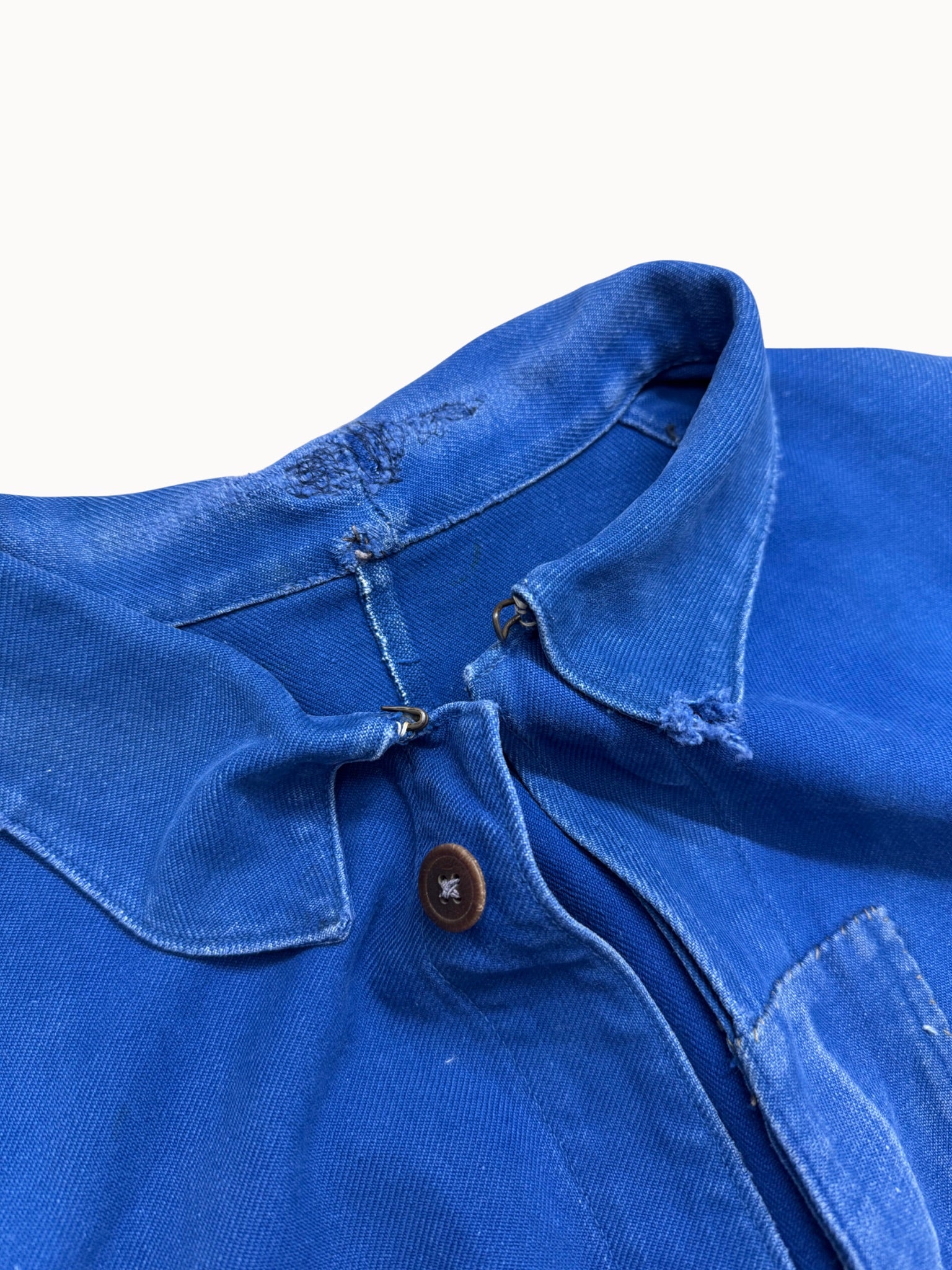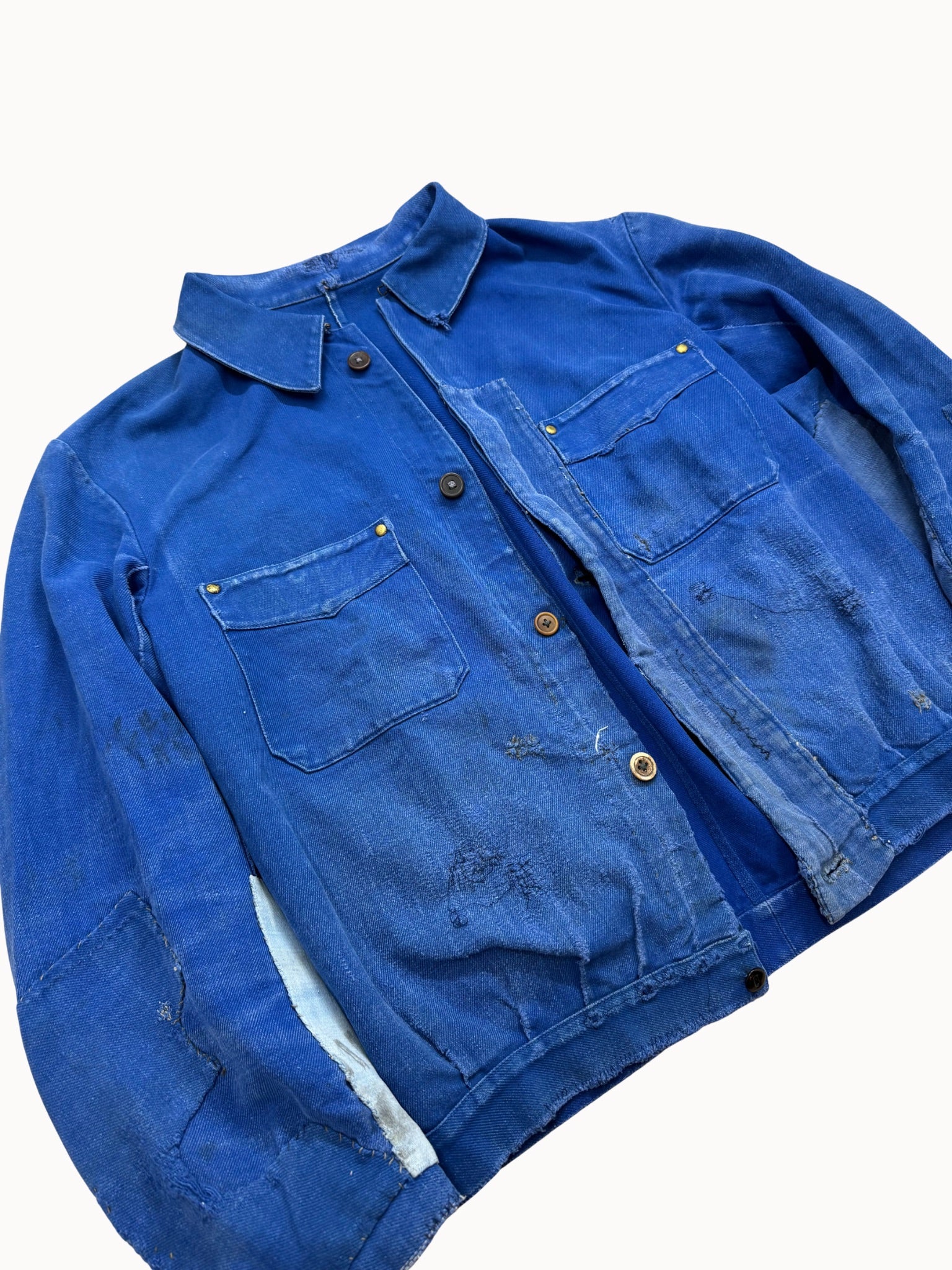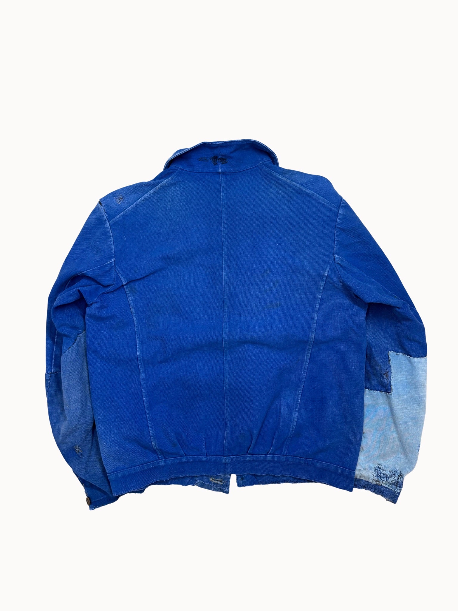 Die Kontraste zwischen tiefem Indigo und hell ausgeblichenen Partien verleihen der Jacke ihre besondere Ausstrahlung – ein klassisches Sammlerstück französischer Workwear.