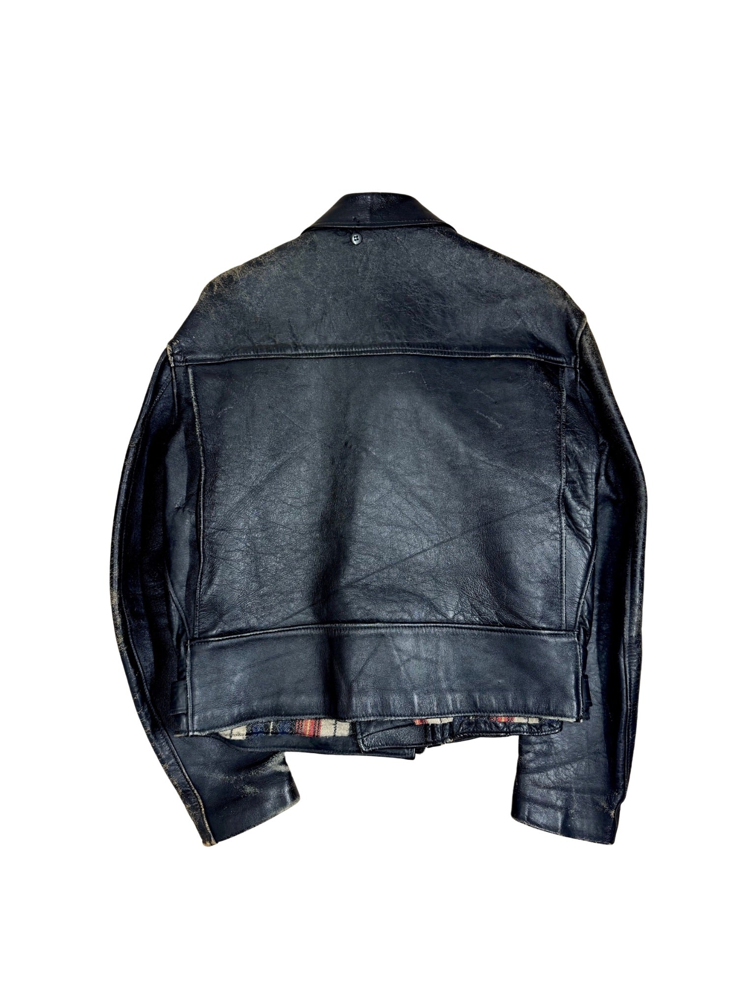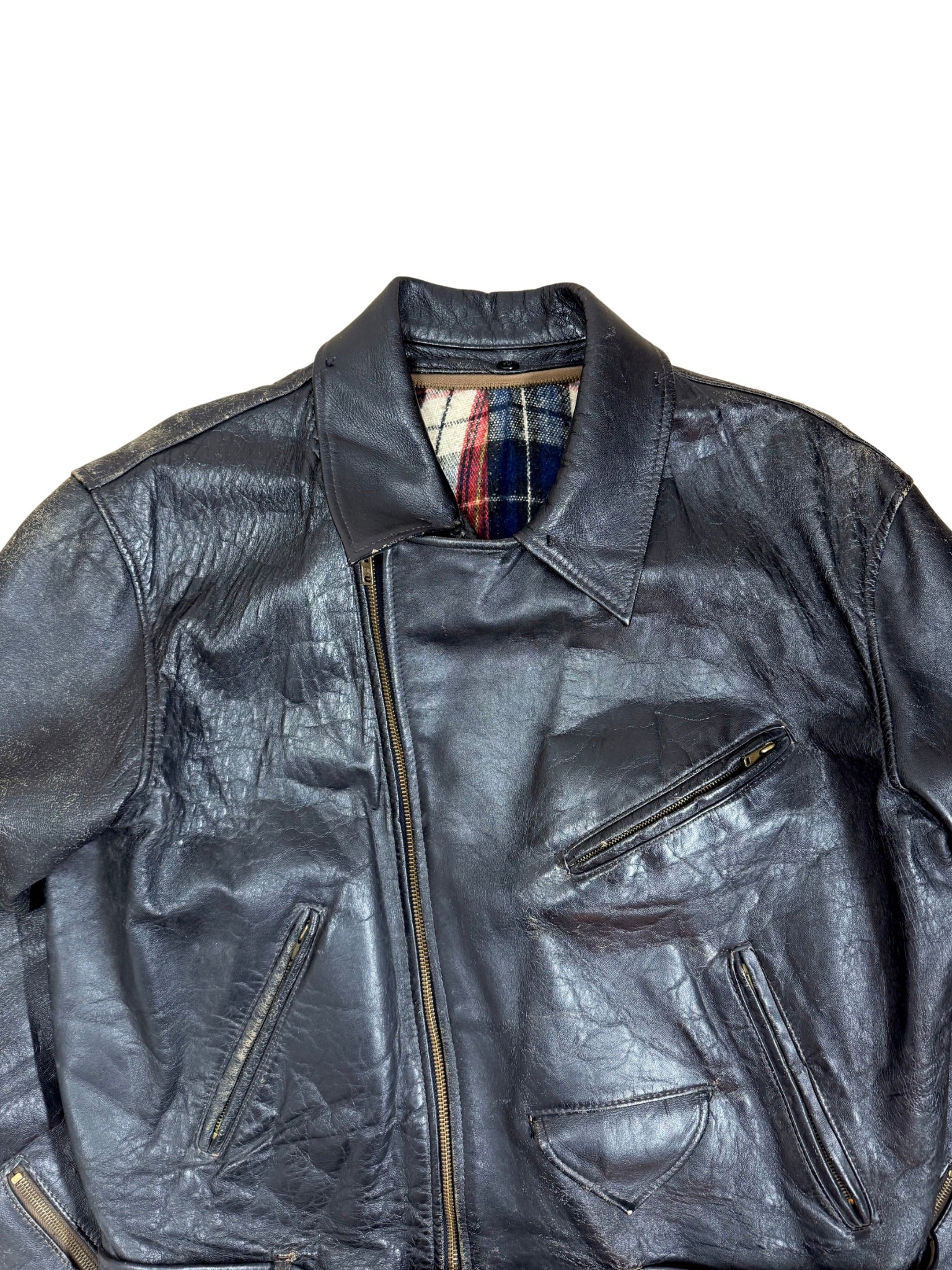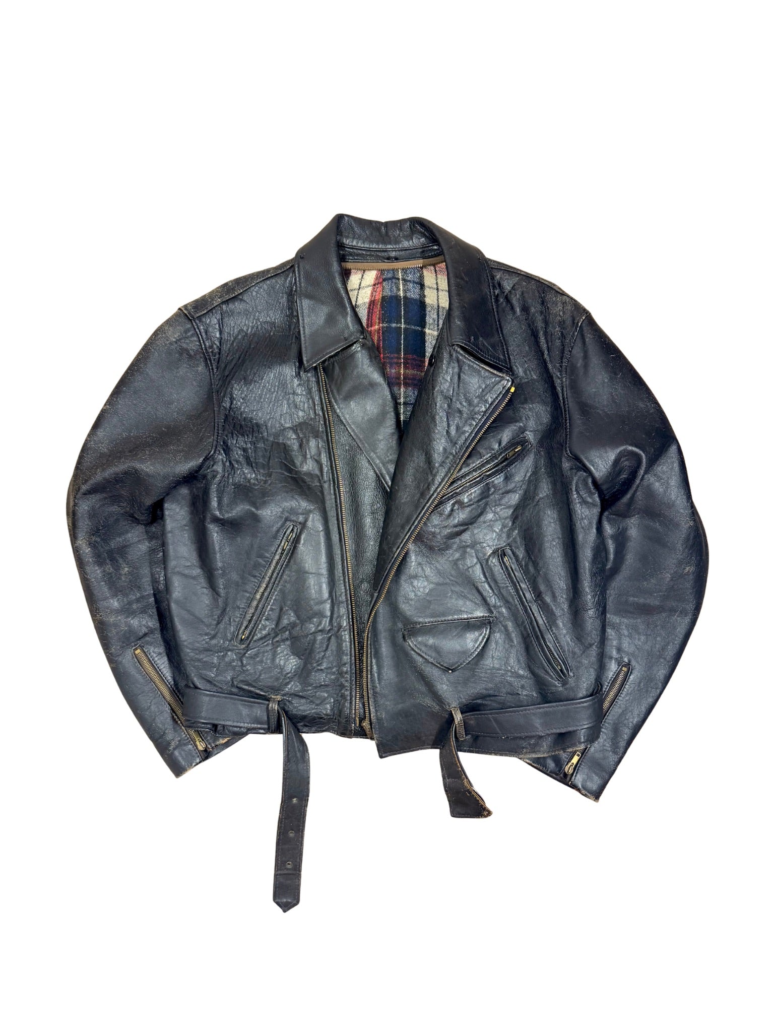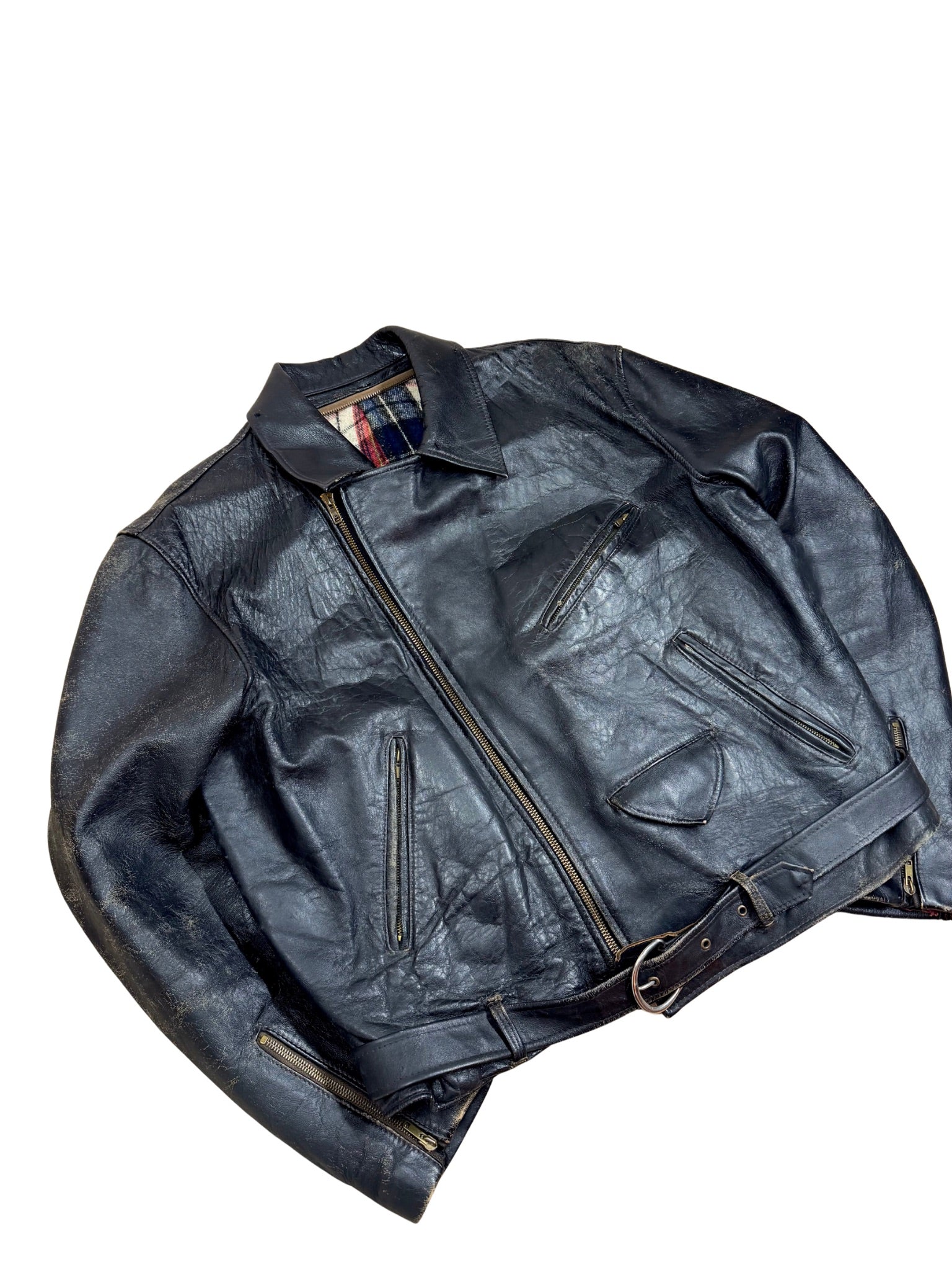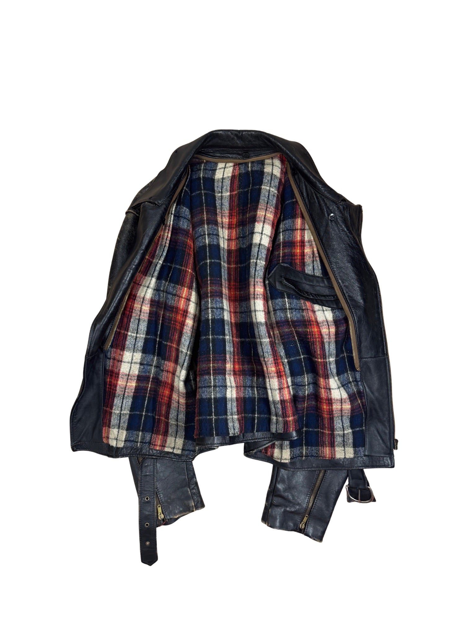 Schwere vintage Lederjacke mit asymmetrischem Reissverschluss, Taillengürtel und kariertem Flanellfutter. Gewachsenes Leder, ehrliche Patina. Ein echtes Rider-Piece.