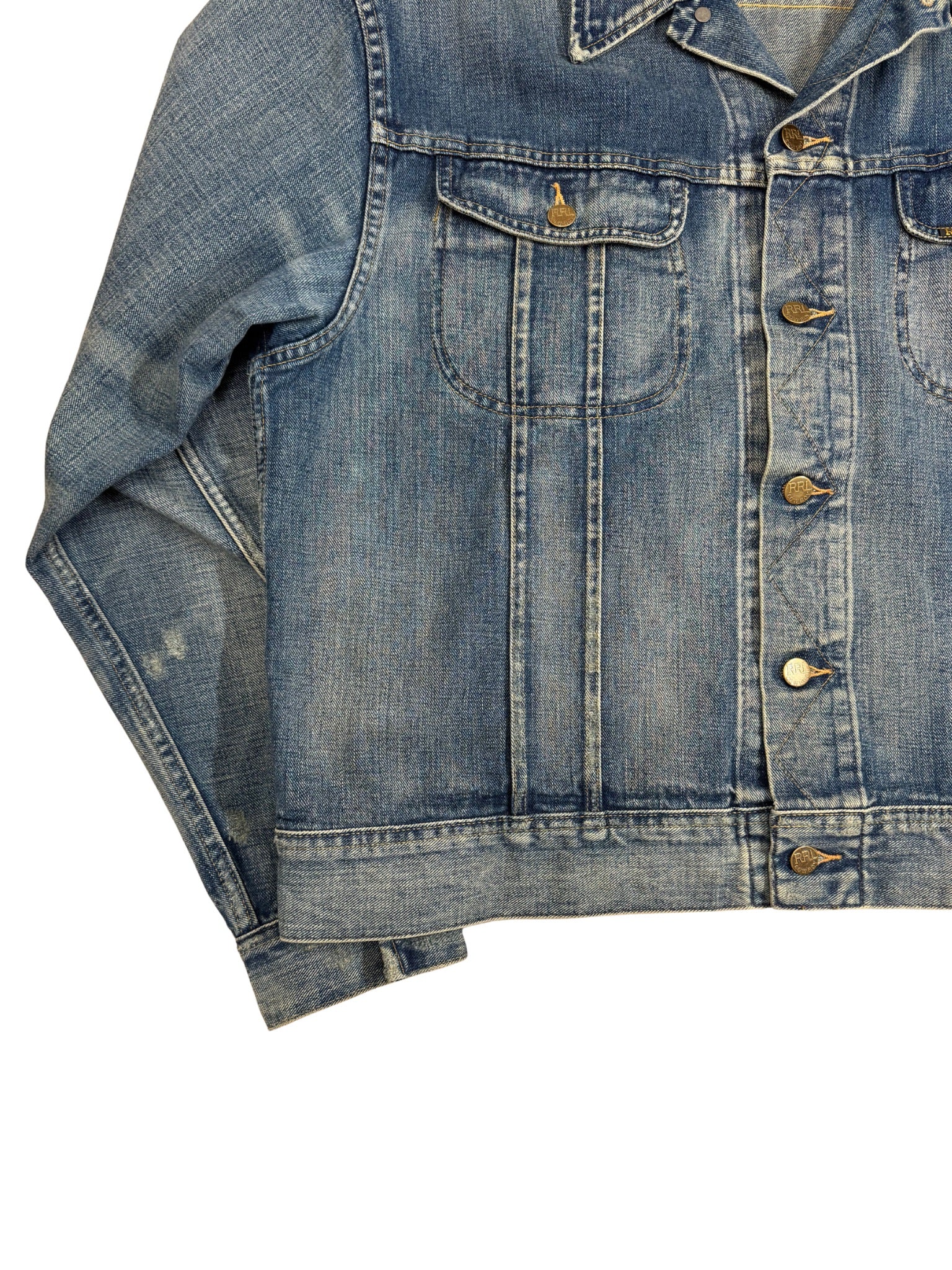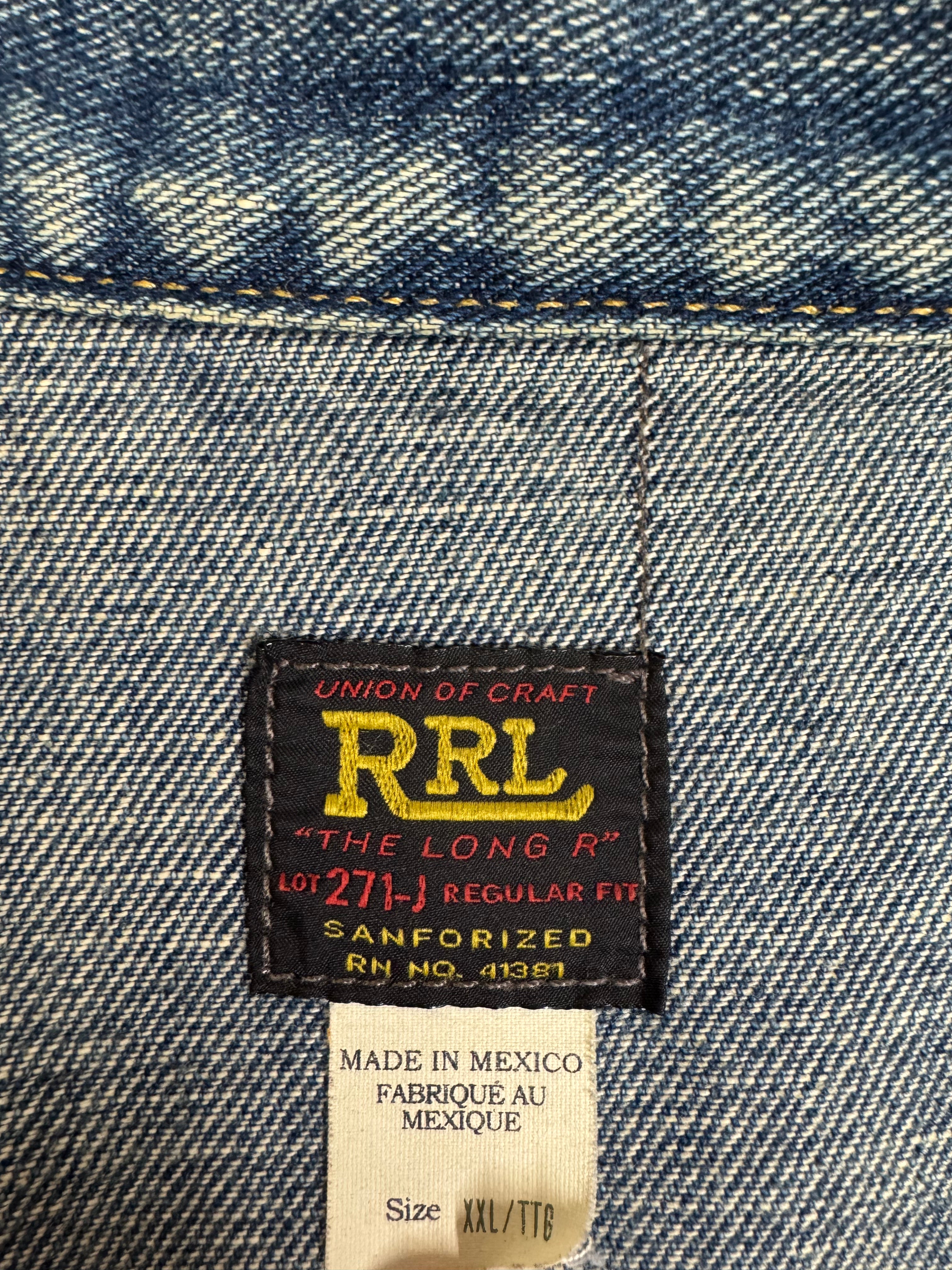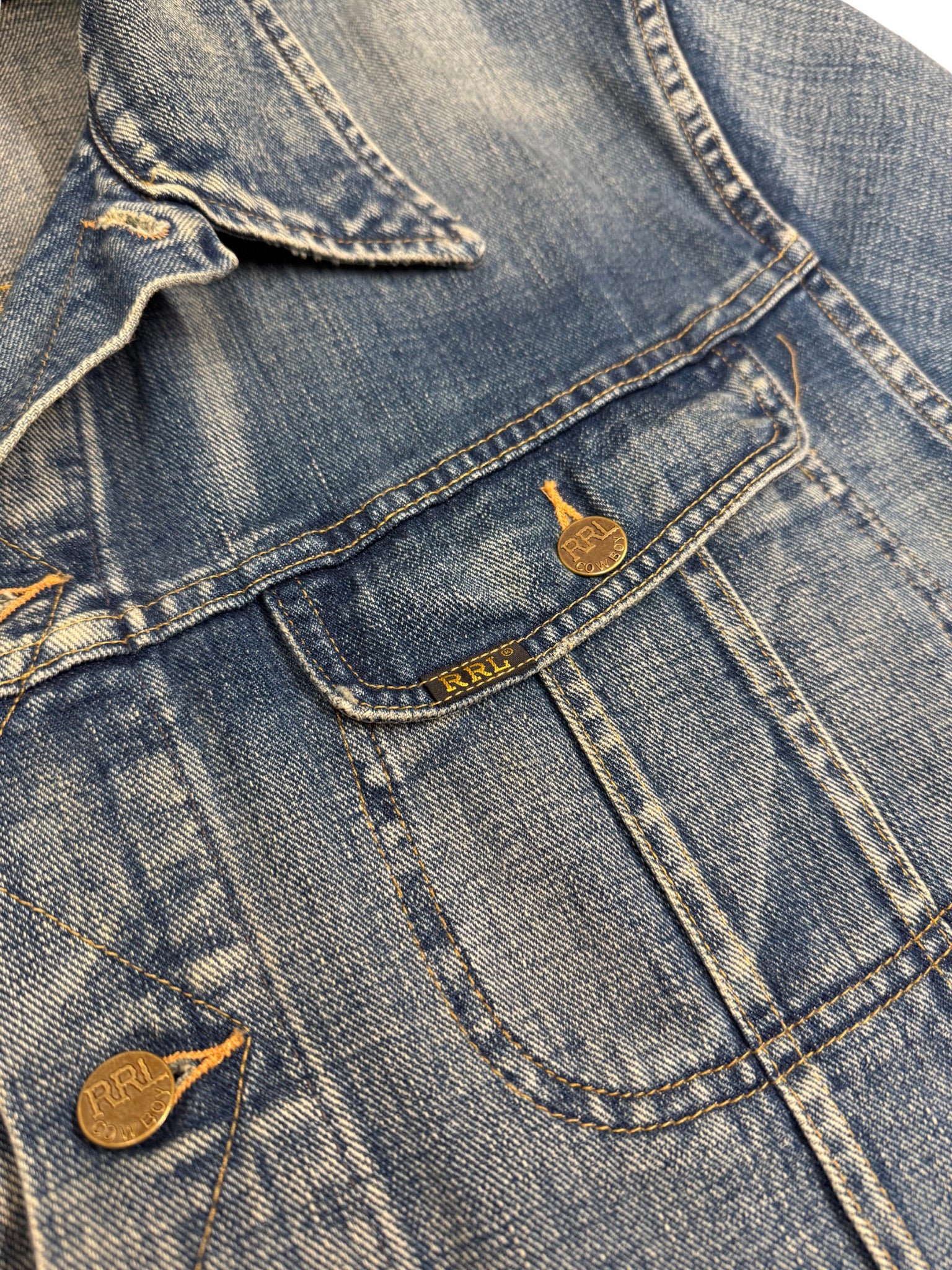 RRL Denim Trucker Jacket im klassischen Leeland-Schnitt. Schwerer, sanforisierter Denim mit natürlichem Fade, klare Linien, kompromisslose Verarbeitung.