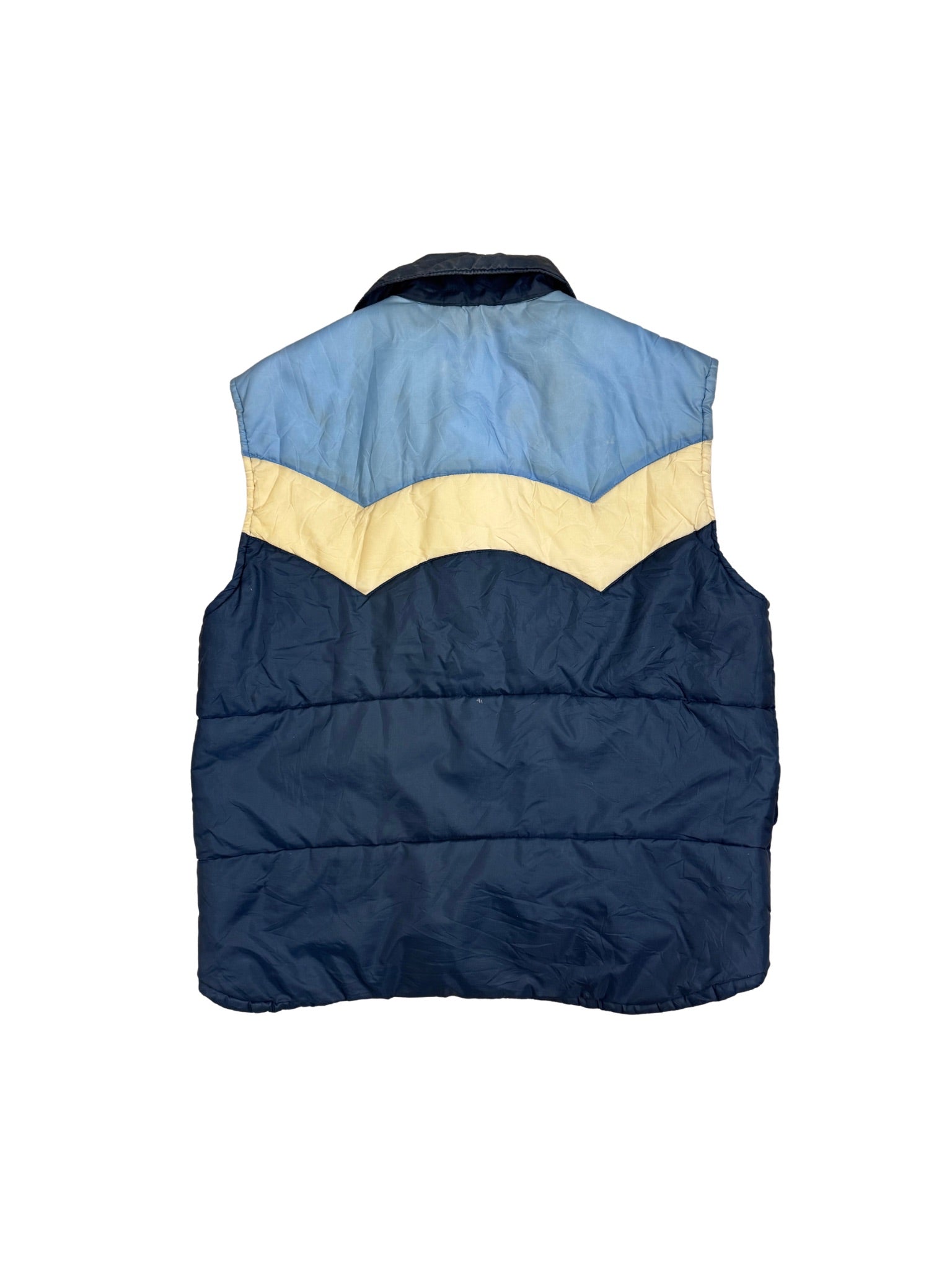 Diese vintage Steppweste überzeugt durch ihr markantes Chevron-Farbspiel in Blau, Creme und Navy, kombiniert mit einem klassischen Western-Yoke an Schulter und Rücken.