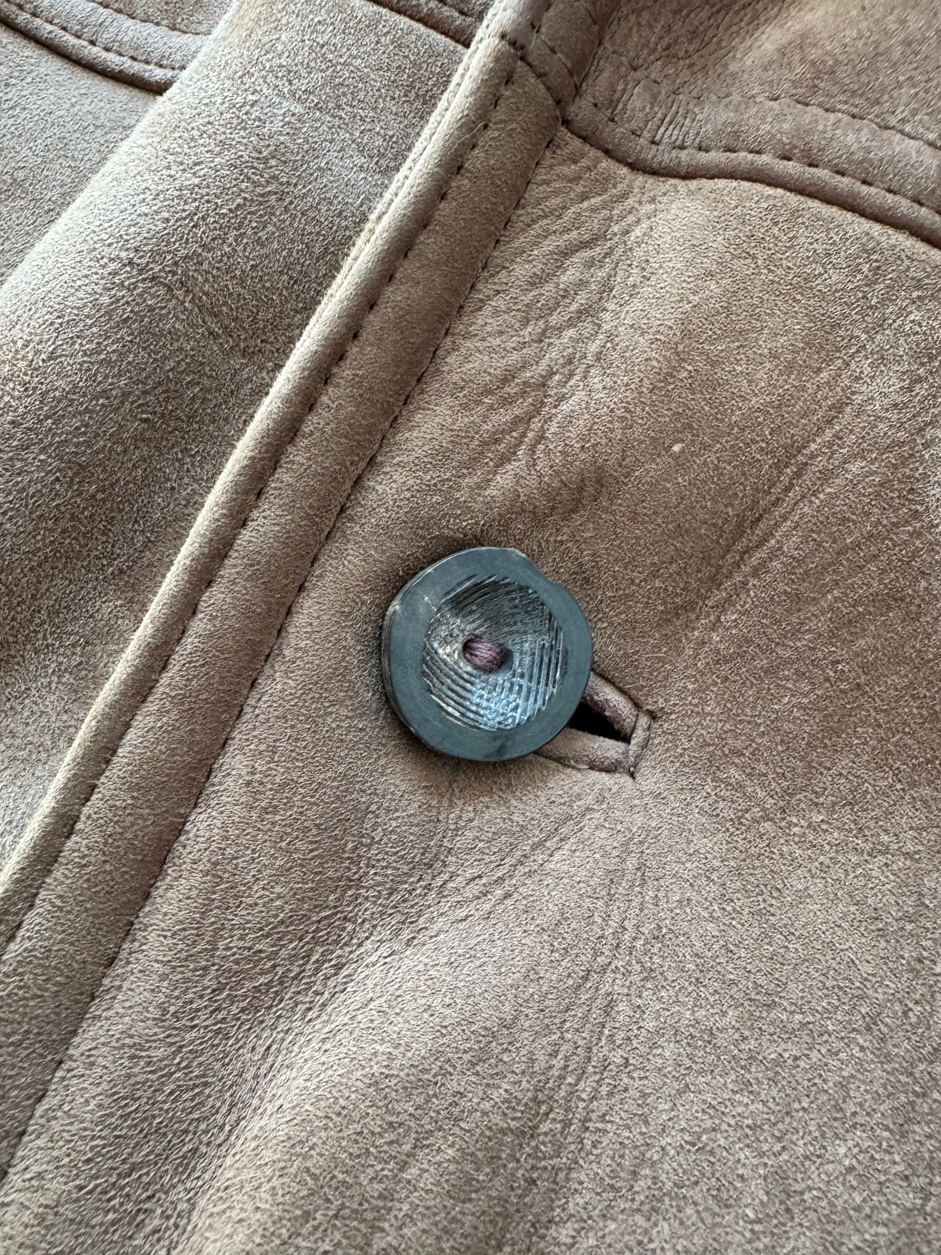Massiver Vintage-Lammfellmantel mit gewachsener Patina. Außen echtes Veloursleder, innen dichtes, naturbelassenes Lammfell. Breiter Reverskragen, Knopfleiste, schräge Fronttaschen.