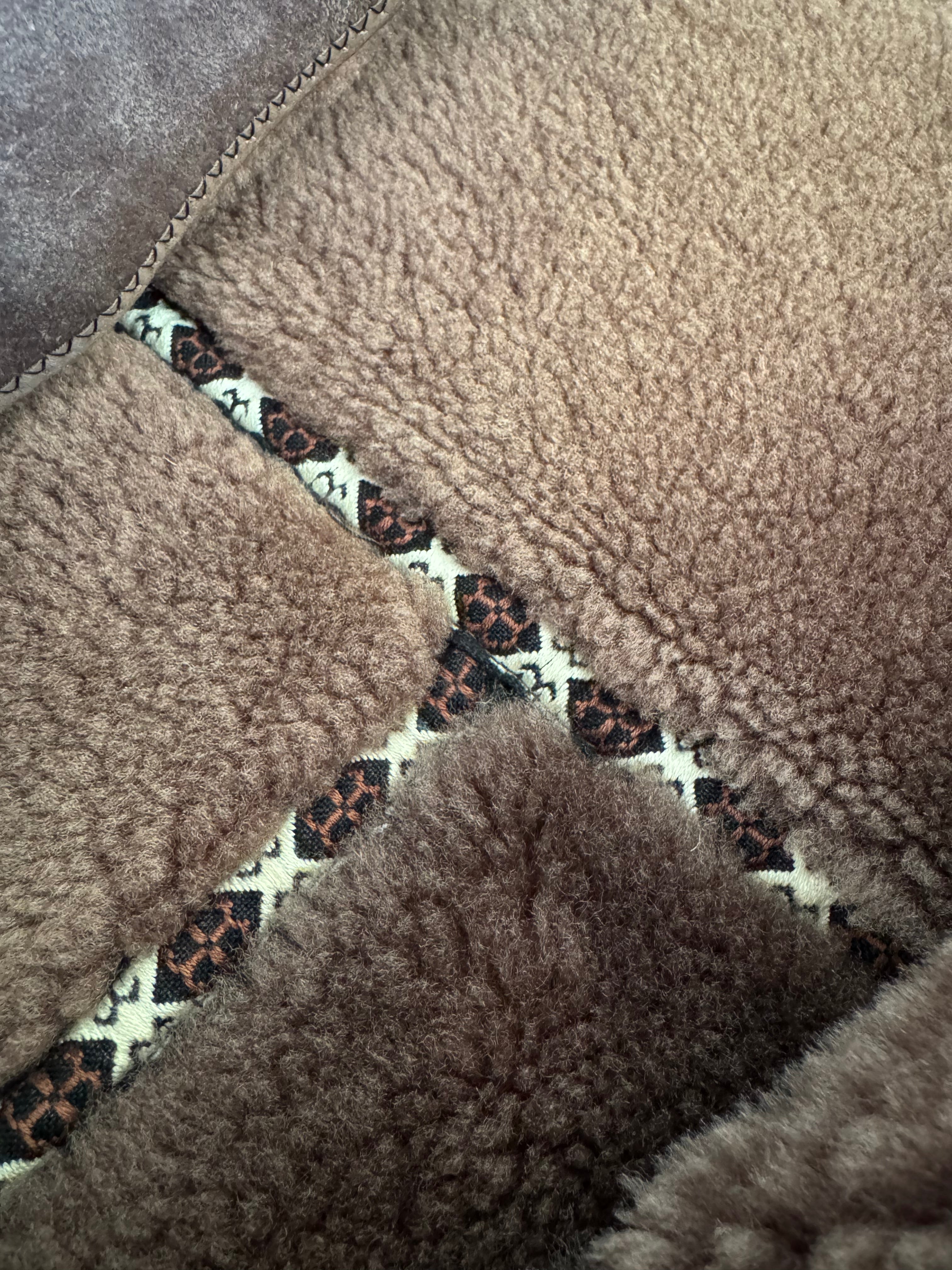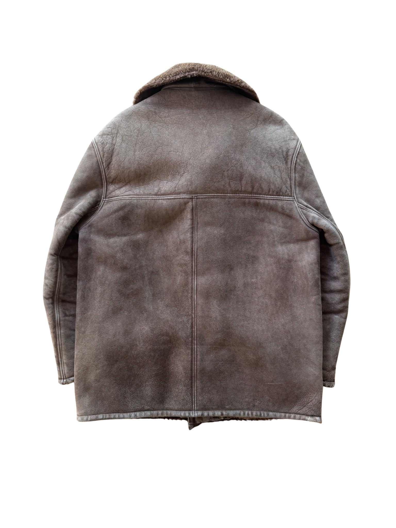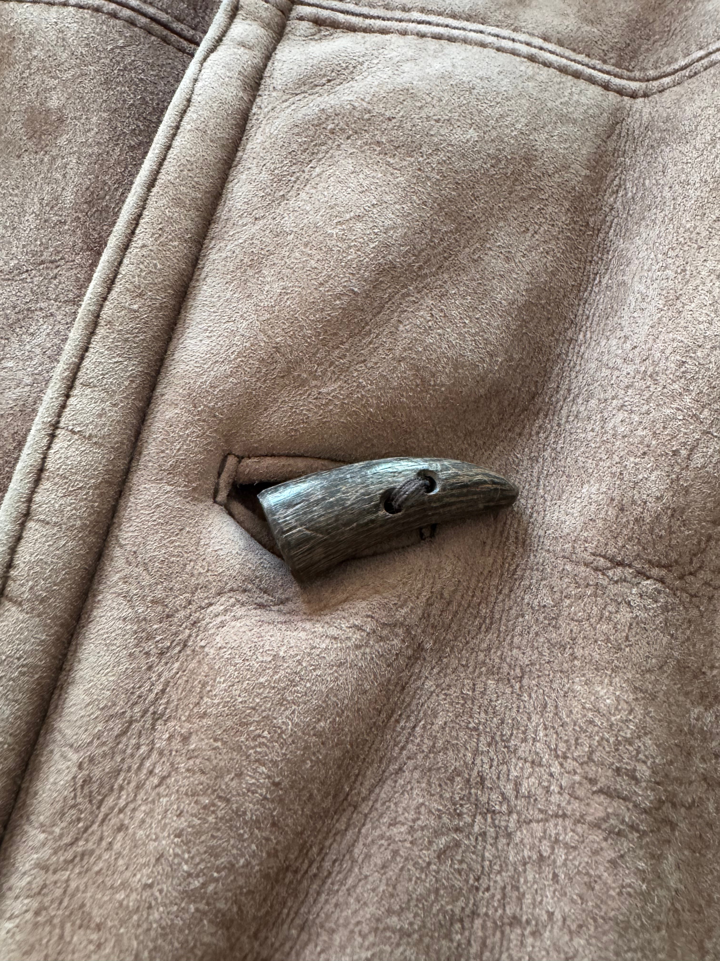 Schwerer Vintage Shearling Duffle Coat mit charaktervollen Horn-Toggle-Verschlüssen. Aussen robustes Wildleder mit ausgeprägter, ehrlicher Patina. Innen vollständig gefüttert mit dichtem, dunklem Lammfell – extrem warm, kompromisslos funktional.
