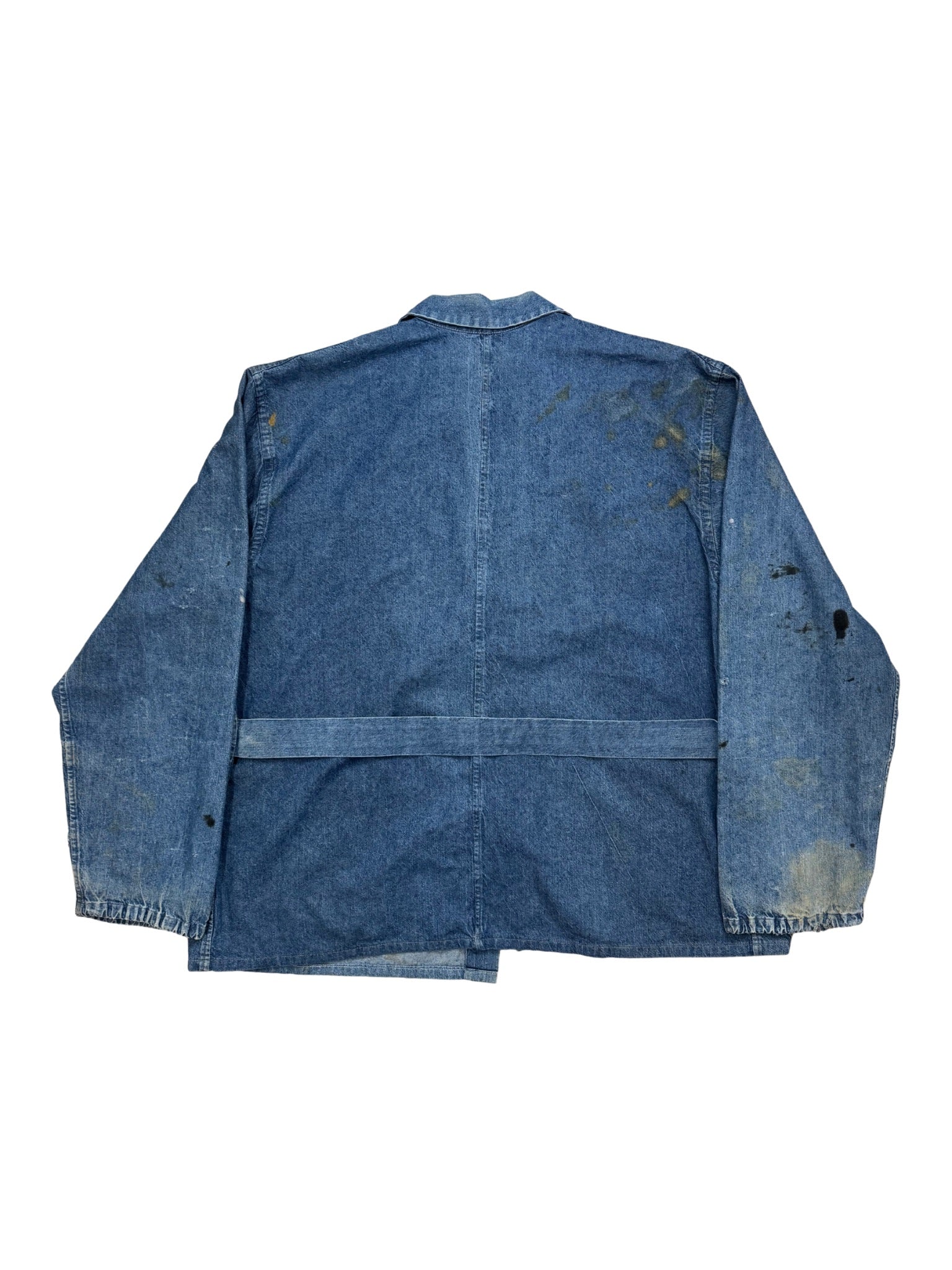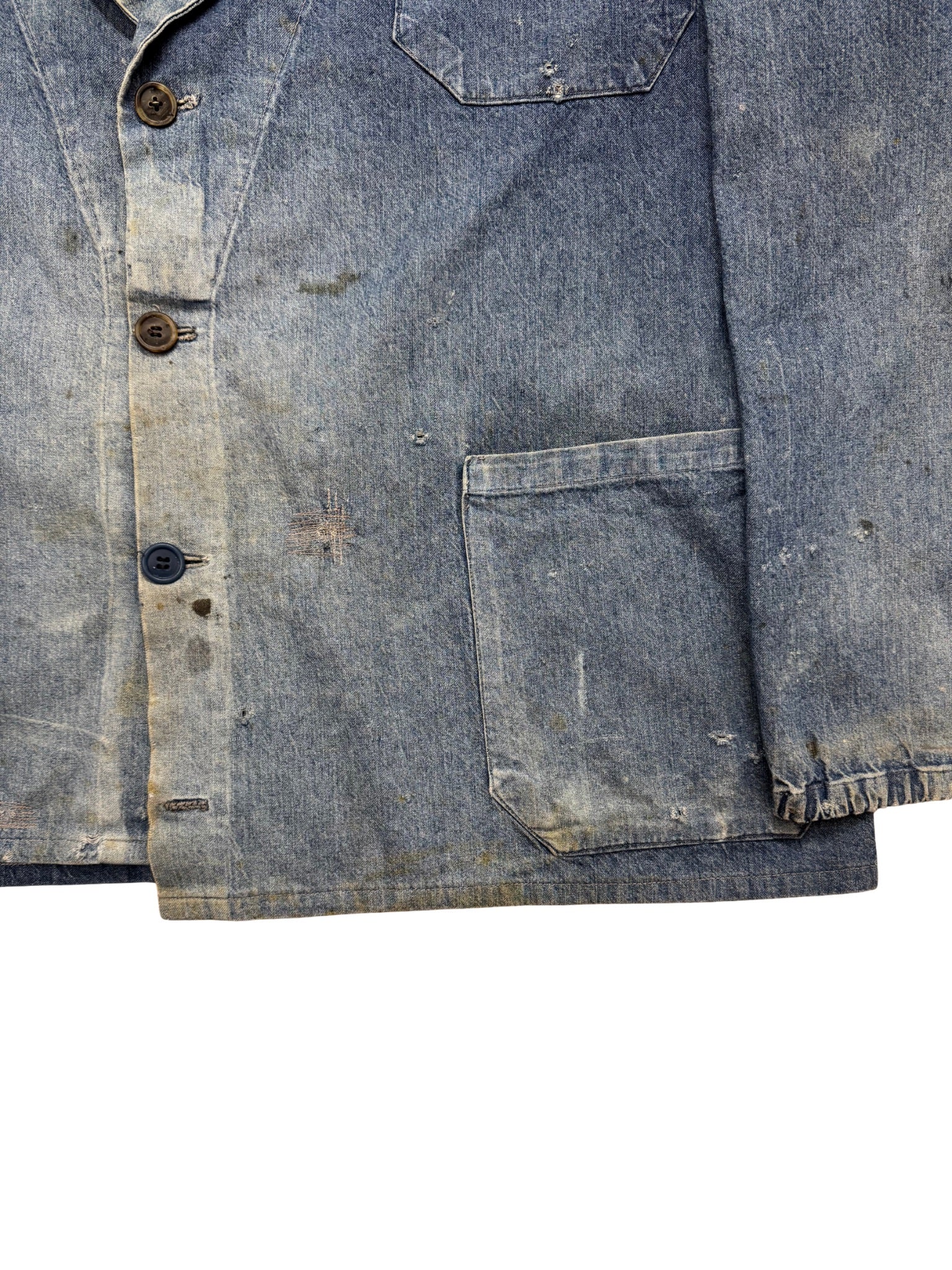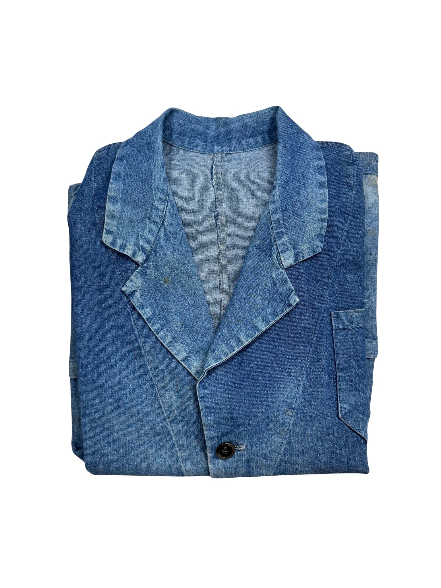 Workwear trifft auf Tailoring. Mittelschwerer Denim mit weichem, sonnengebleichtem Fade. Farbspuren, Reparaturen und abgewetzte Kanten erzählen seine Geschichte – kein Rework, kein Fake. Echte Patina, echter Charakter.