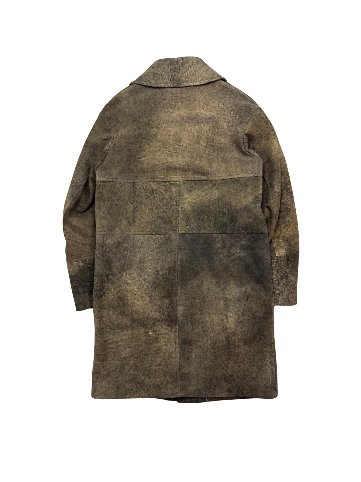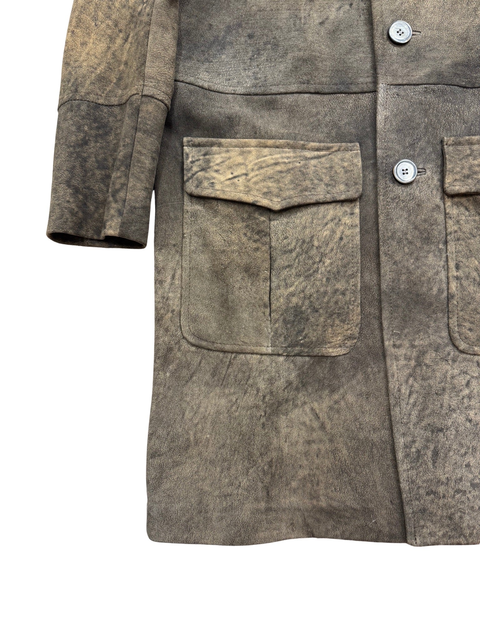 Ein Arbeitsmantel aus Sämischleder, gefertigt von Meindl in den 1960ern. Weiches Hirschleder, hell gegerbt, draussen dunkel geworden – Schicht um Schicht Patina. Drei Taschen, klarer Schnitt, schwere Knöpfe. Warm, widerstandsfähig, leise im Tragen. Ein funktionales Stück Alpenhandwerk, das Zeit nicht kennt.