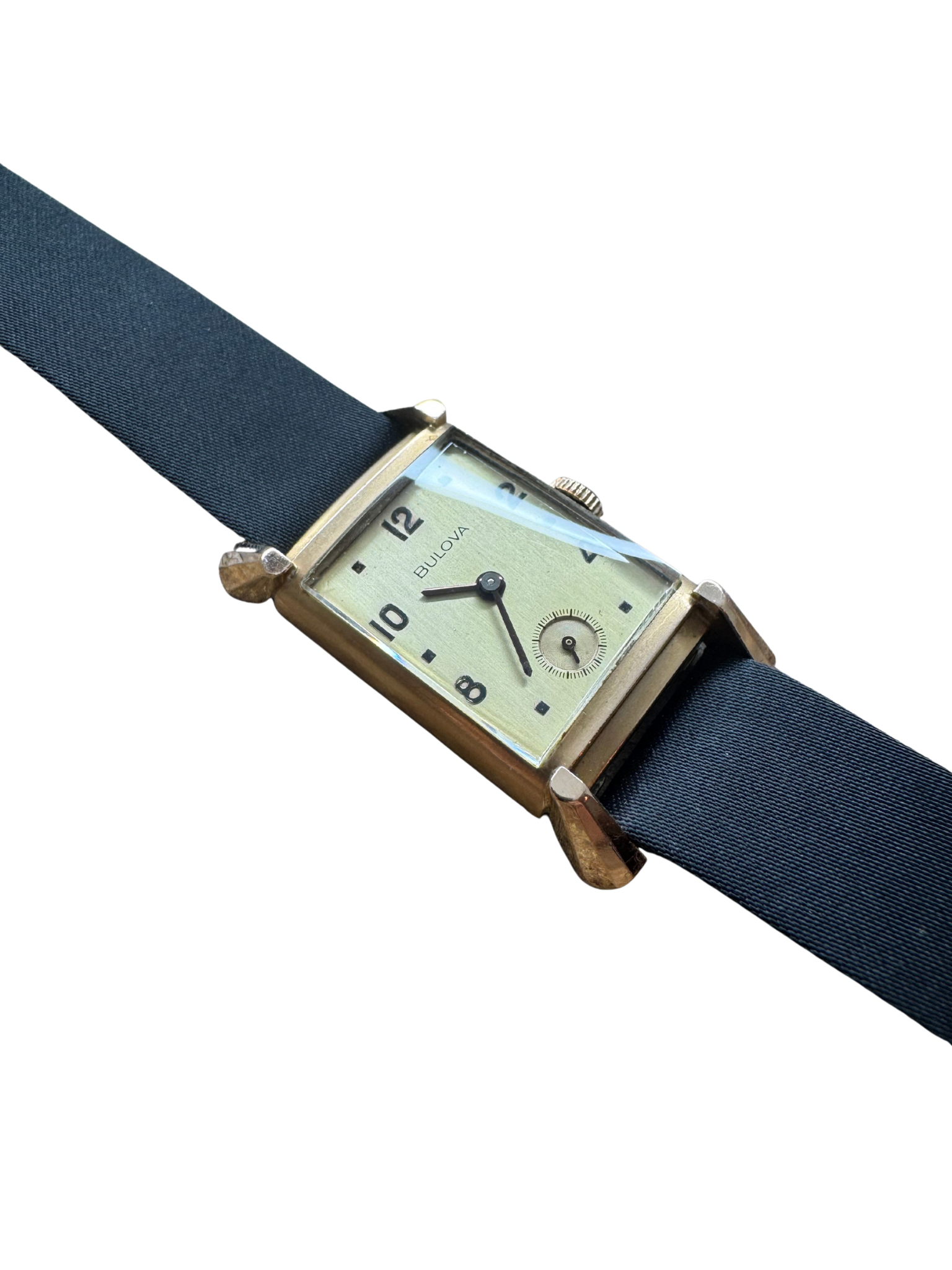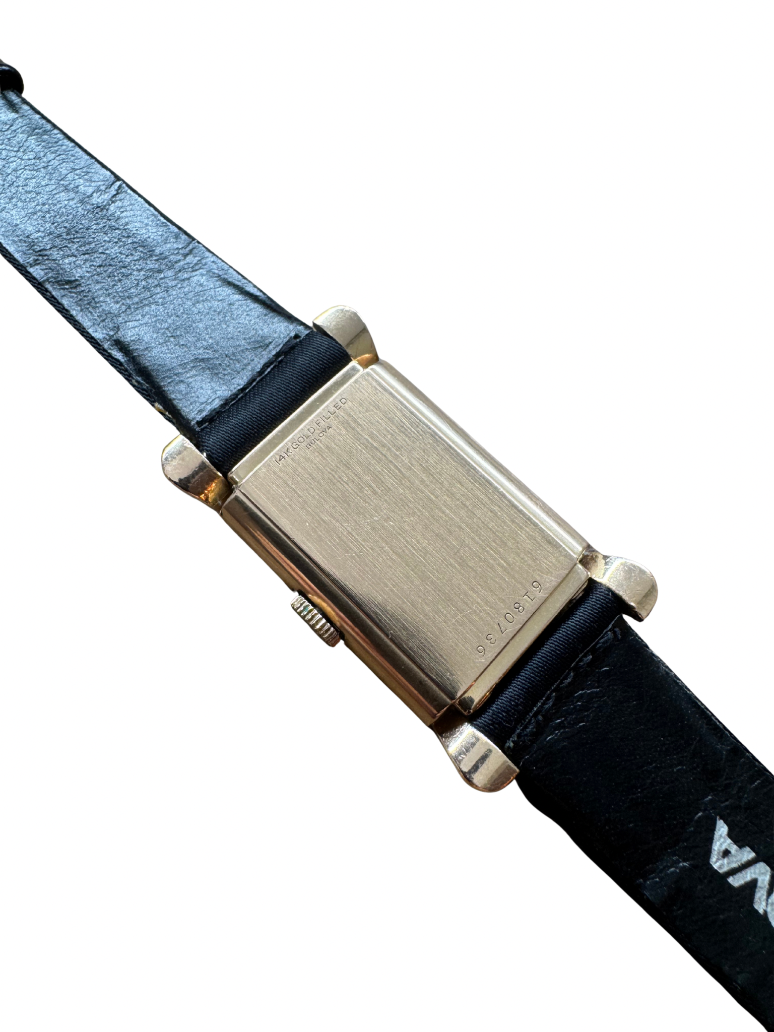 Elegante rechteckige Armbanduhr von Bulova aus den 1940er–50er Jahren. Das Gehäuse besteht aus 14 Karat Gold Filled und überzeugt durch seine klaren Linien und das reduzierte Zifferblattdesign.