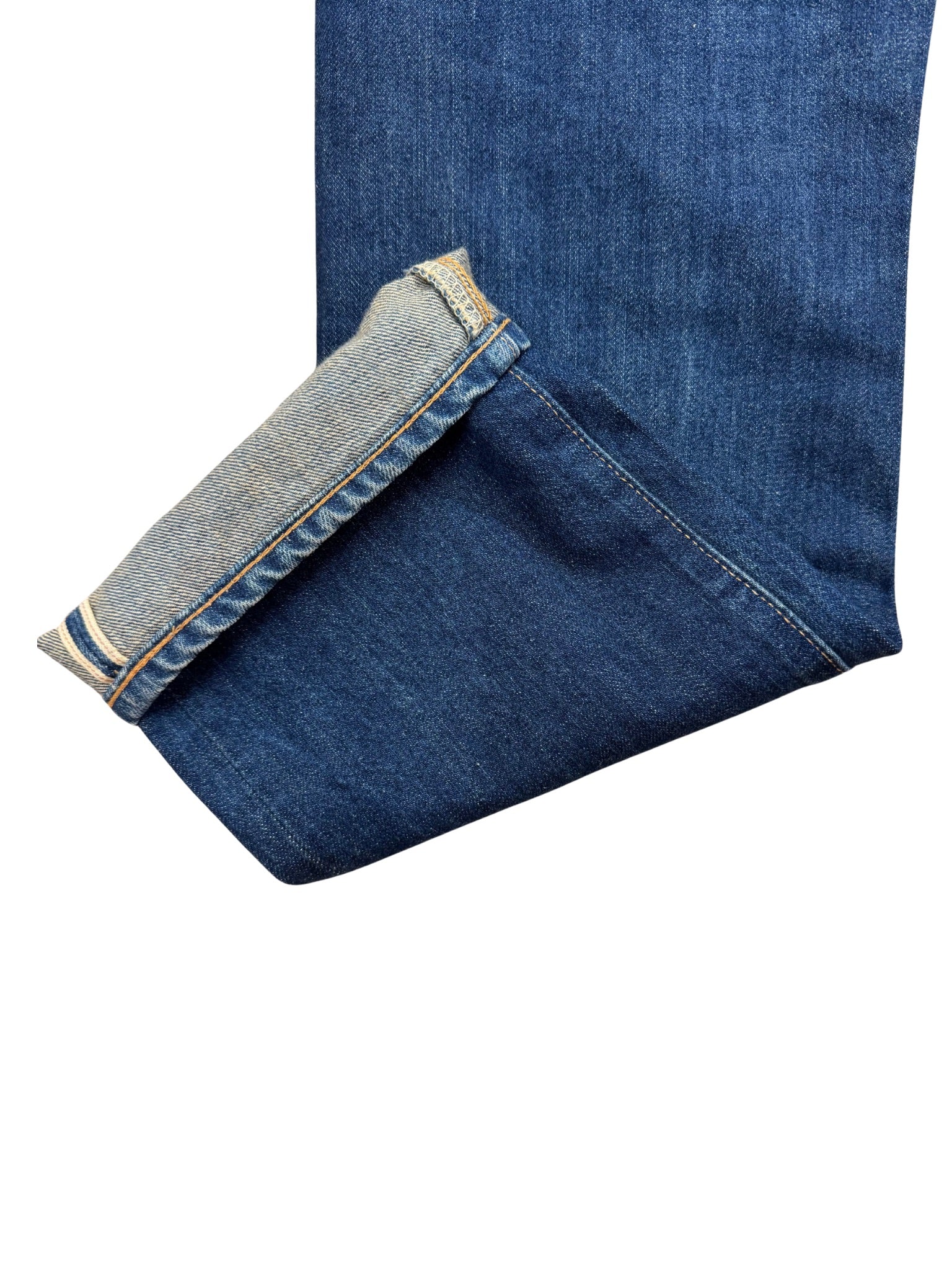 Dieses Reissue bewahrt den Charakter des Originals: authentischer Indigo-Fade, Kupfer-Rivets, periodenkorrekter Stitch-Mix und ein cleaner Straight Fit.