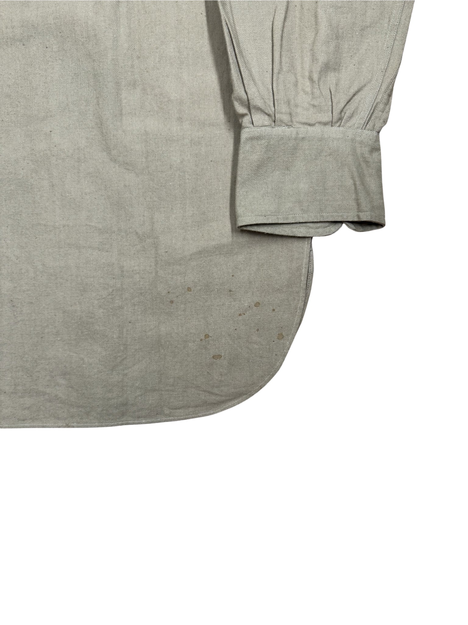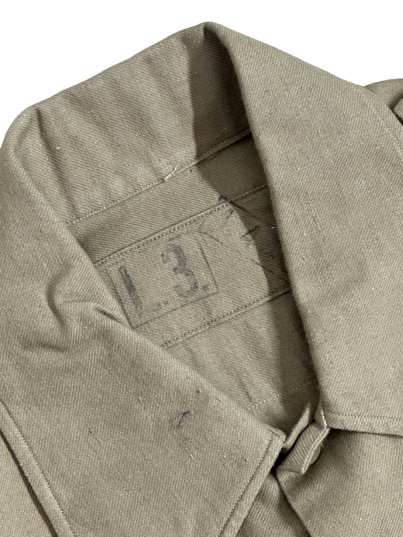 Vintage British Army Khaki Service Shirt mit klassischem Militärdesign, Epauletten und zwei Brusttaschen. Gefertigt aus robustem Cotton Drill mit authentischer Patina und originalem Stempel L.3. im Kragen. Das Hemd hat eine längere Passform, wie sie bei Uniformshirts üblich ist.