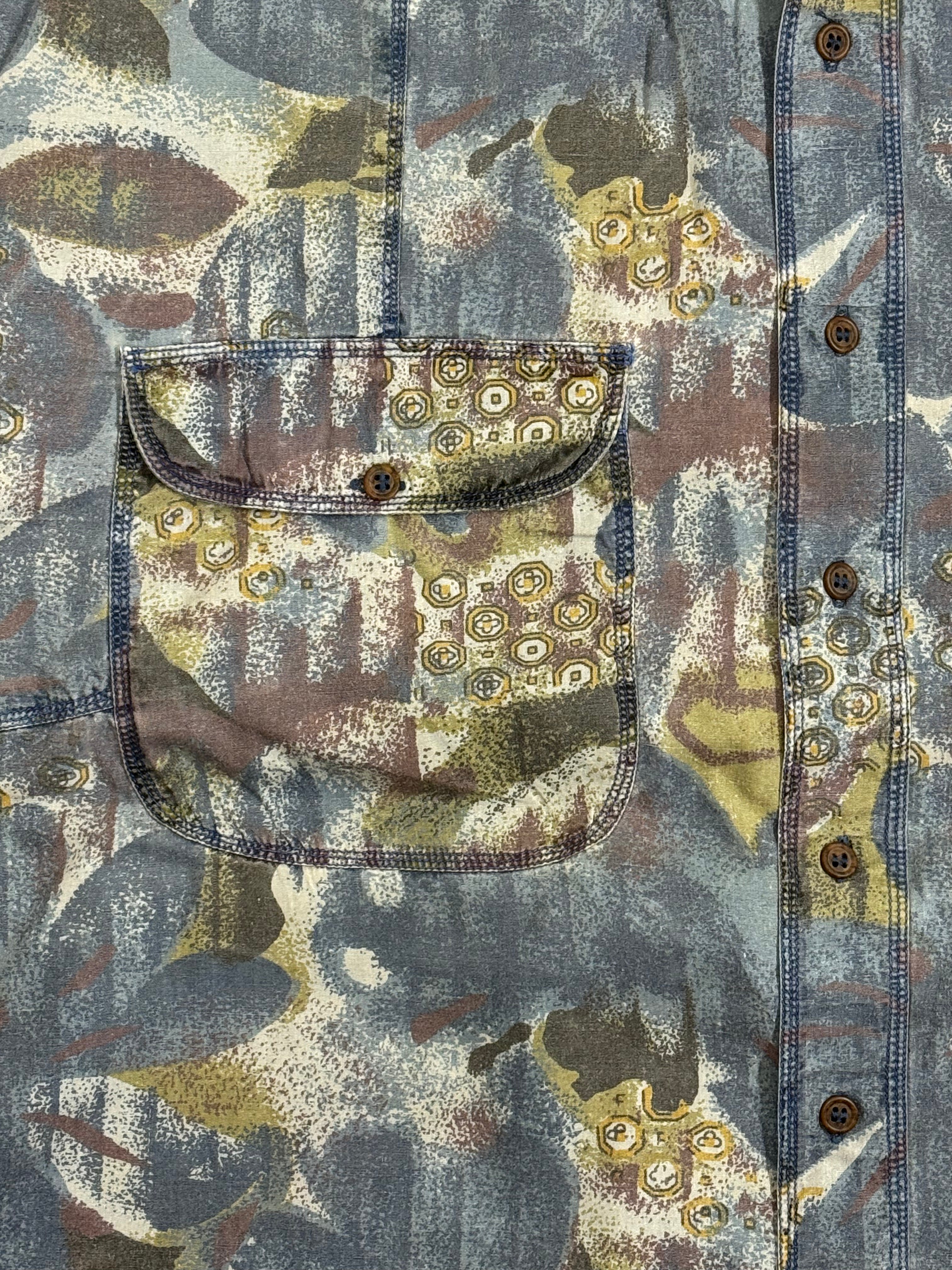 Vintage Hemd aus der EK Fabric Concept Linie mit markantem abstraktem Allover-Print in Blau-, Oliv- und Erdtönen. Robuster Baumwollstoff, zwei Brusttaschen und ein klassischer Utility-Schnitt verleihen dem Piece eine charakteristische 90s Outdoor-Ästhetik. Ein seltenes Vintage-Statement mit authentischem Workwear-Charakter.