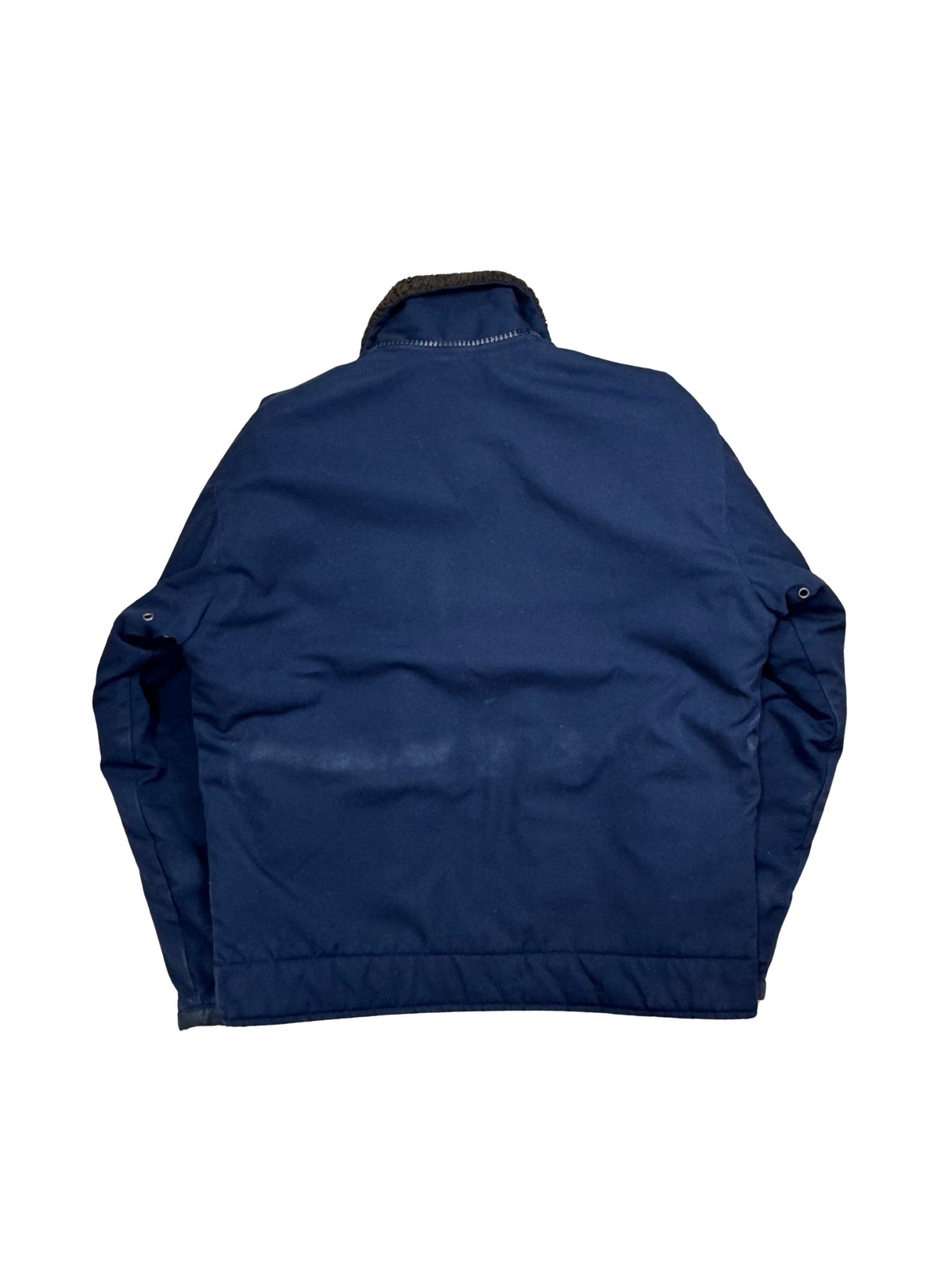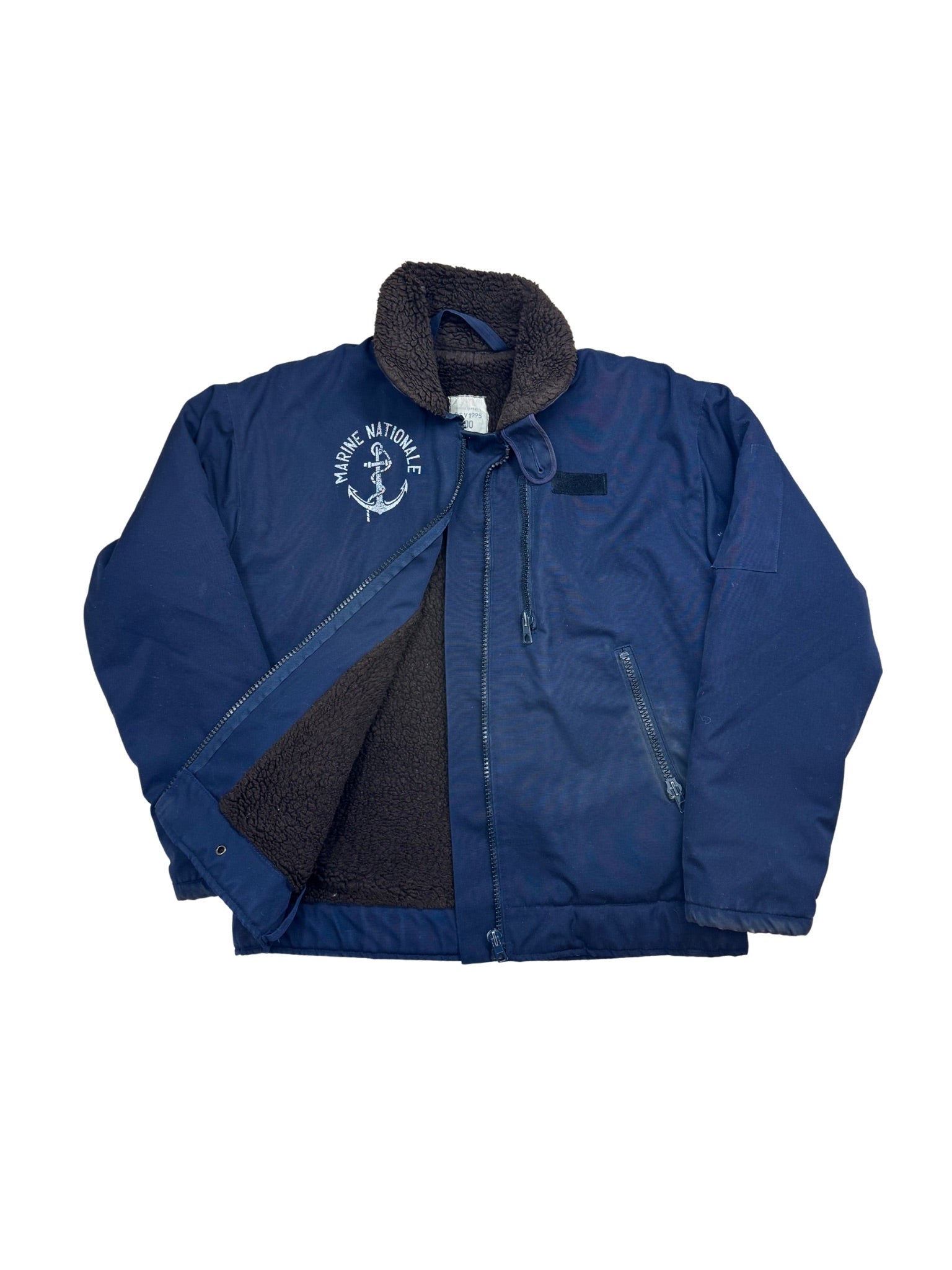 Seltene Vintage Marine Nationale Winterjacke aus den späten 1980er bis frühen 2000er Jahren. Hergestellt aus strapazierfähigem Baumwollmischgewebe mit warmem Sherpa-Futter. Entwickelt für den Einsatz an Bord der französischen Marine – robust, wetterbeständig und funktional. Heute ein authentisches Workwear-Piece mit maritimer Geschichte.