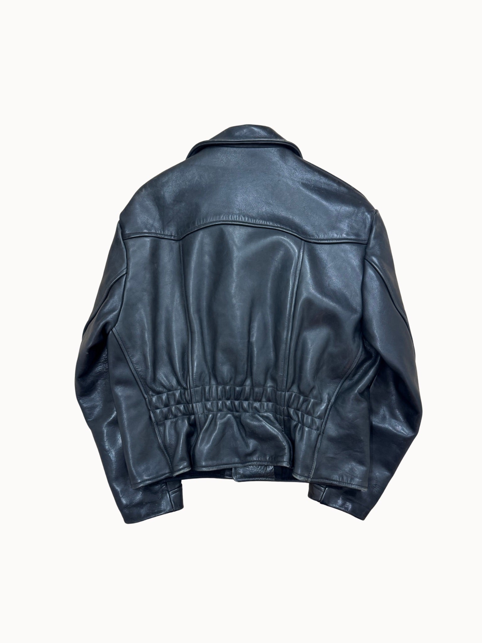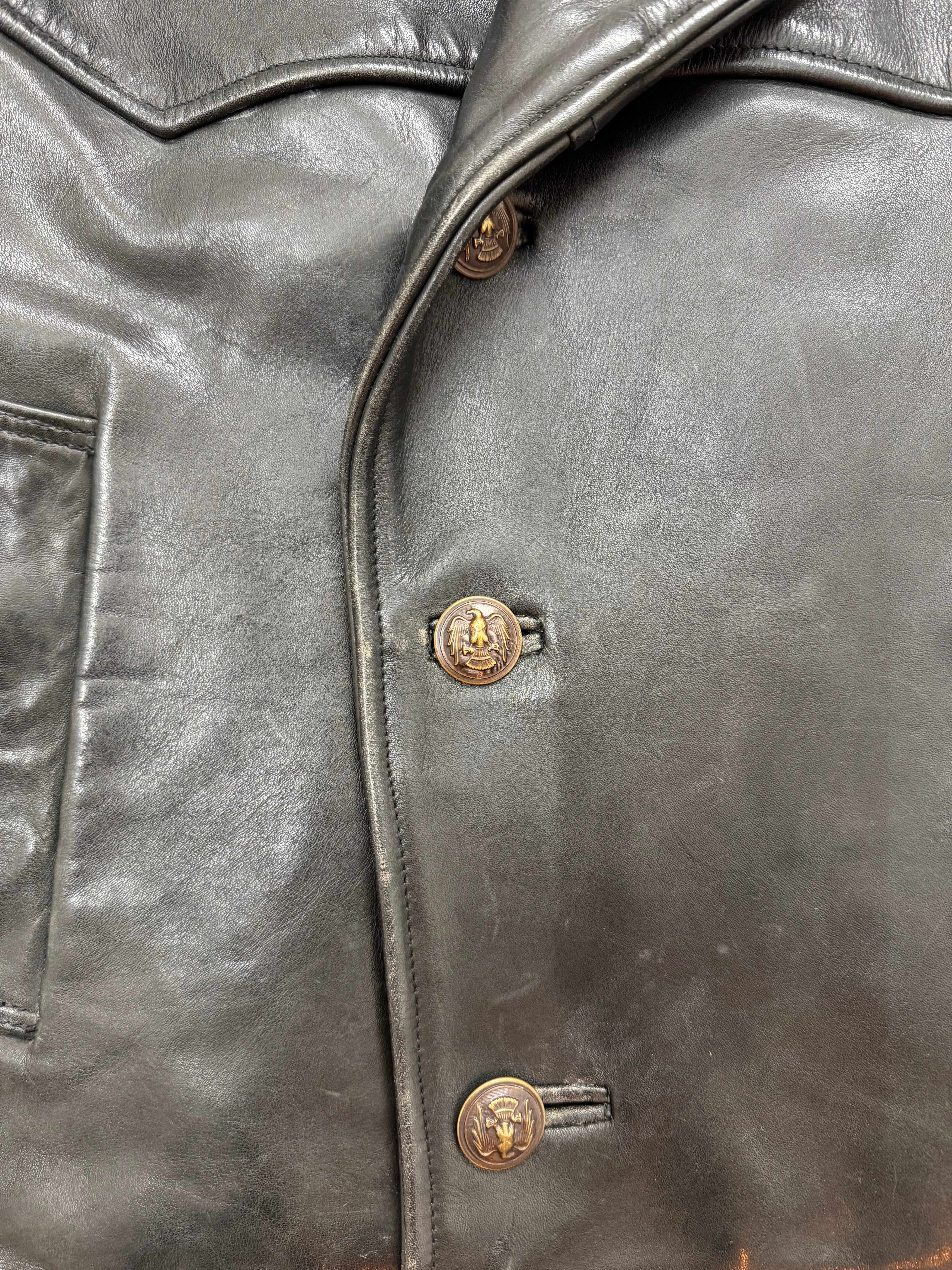 Seltene Vintage-Lederjacke im Military-Stil. Schwarzes Glattleder, breite Revers, zweireihige Knopfleiste mit Adler-Buttons und elastische Rückenpartie. Ein Mix aus Biker- und Uniform-Style, der echte Präsenz ausstrahlt.