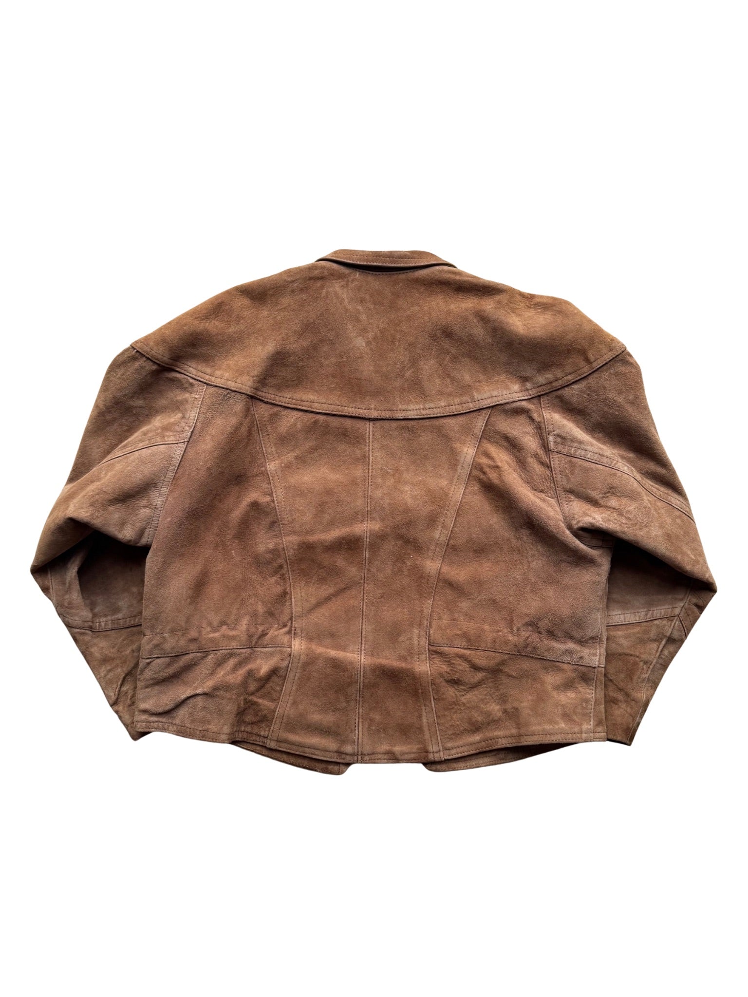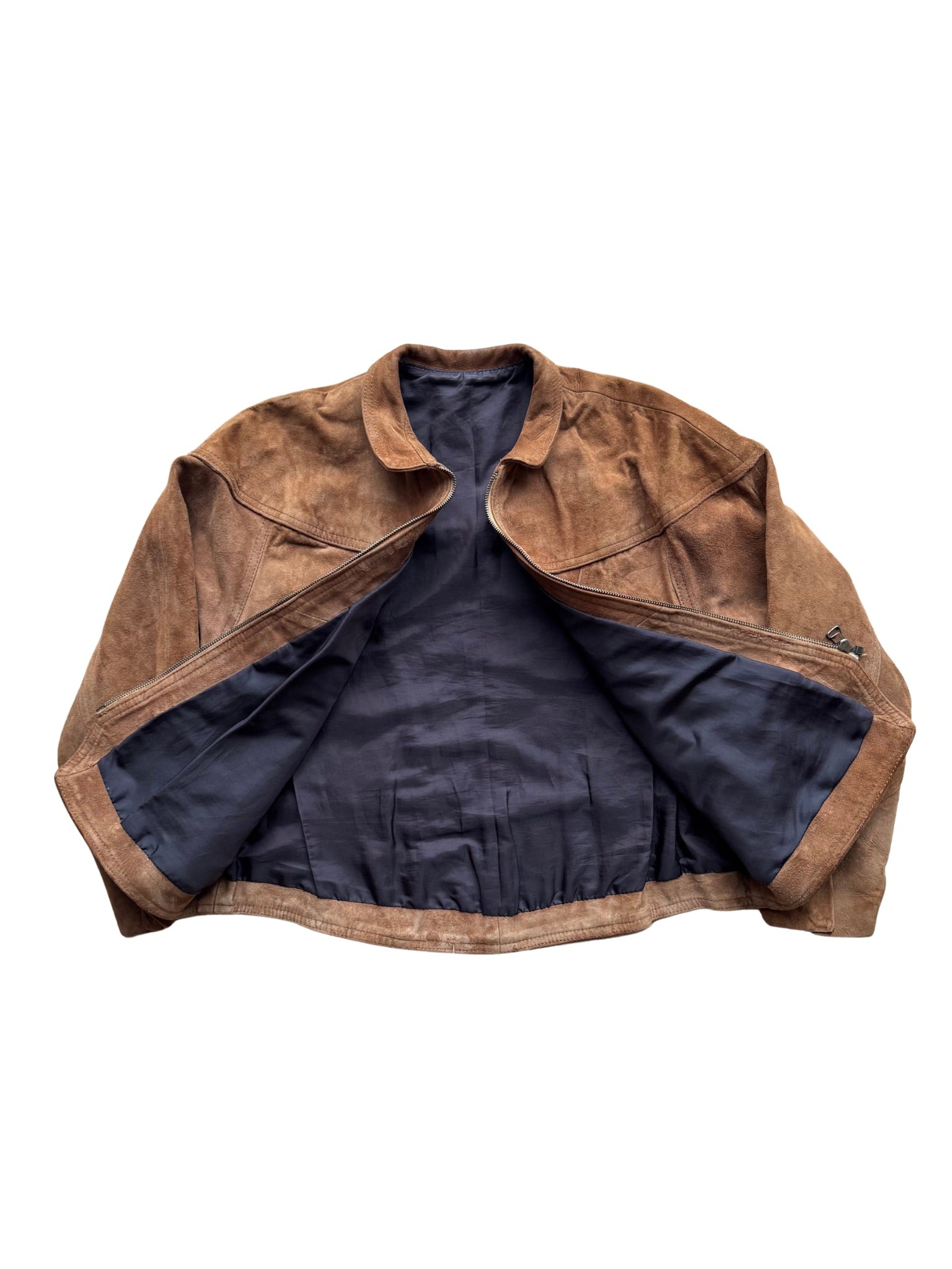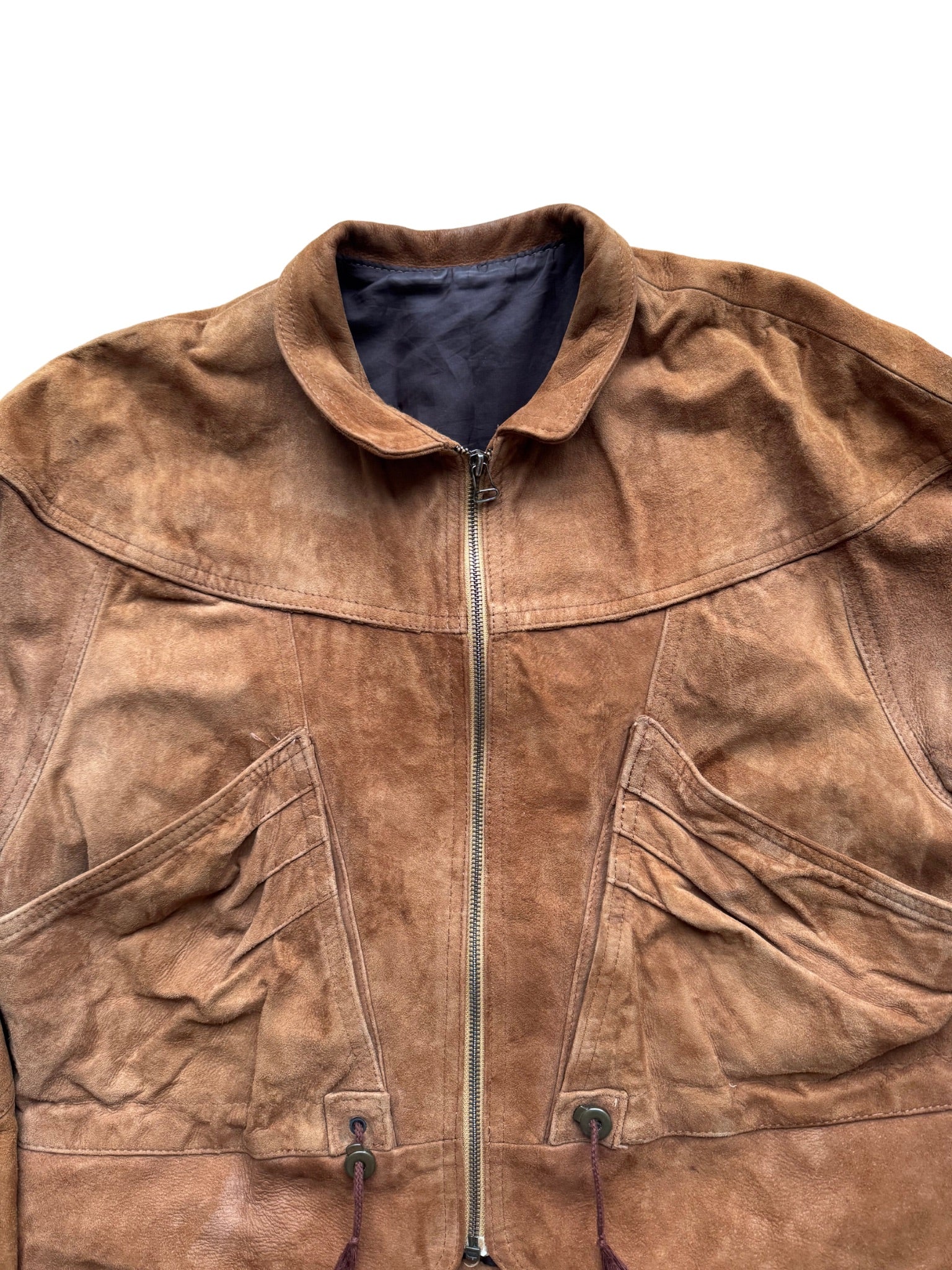 Gefertigt aus gealtertem Wildleder mit authentischer Patina. Boxy Fit, verkürzte Silhouette und markante Schnittführung mit strukturierten Frontfalten. Metallzip, schmaler Kragen und geformte Rückennähte.