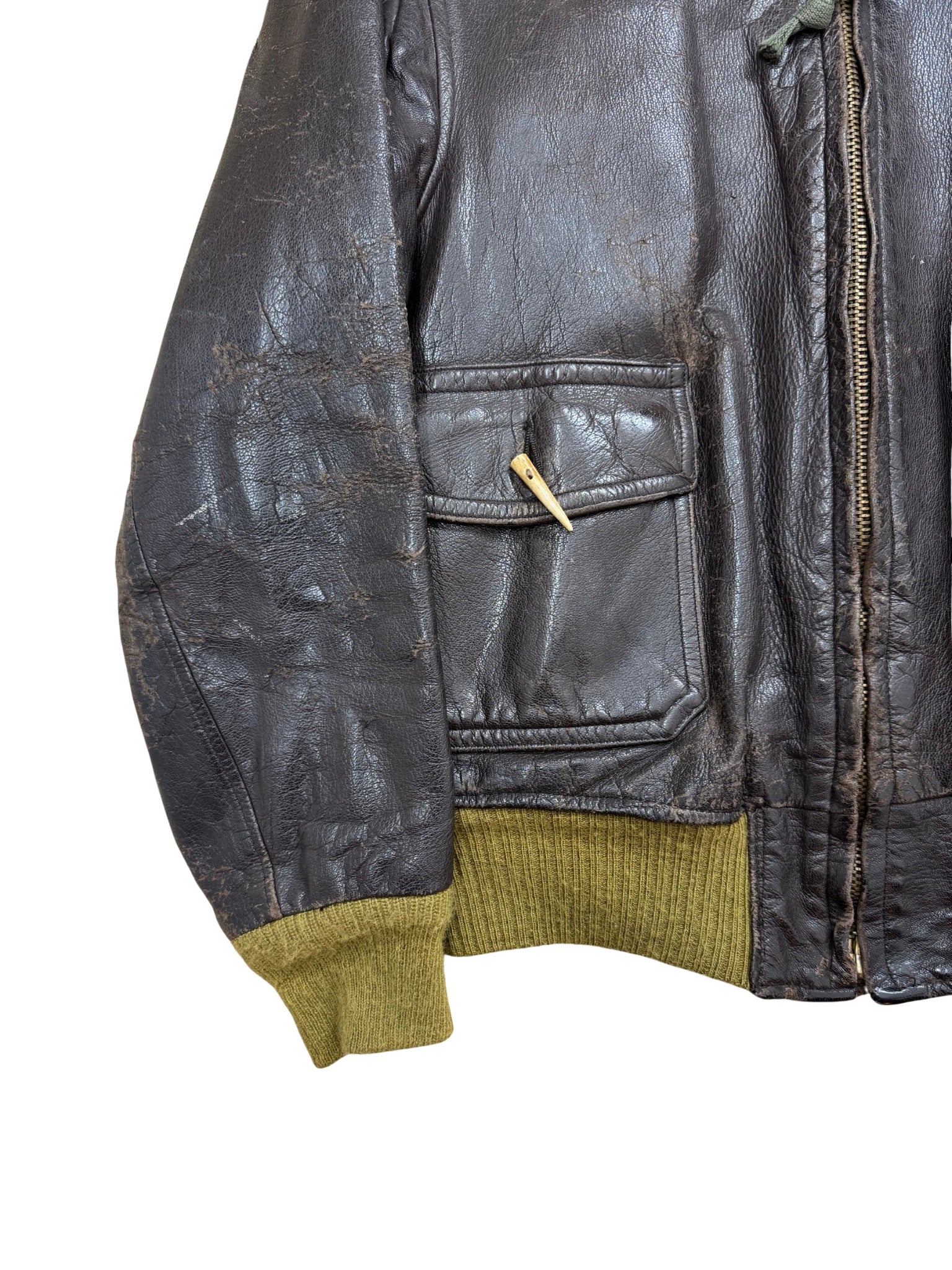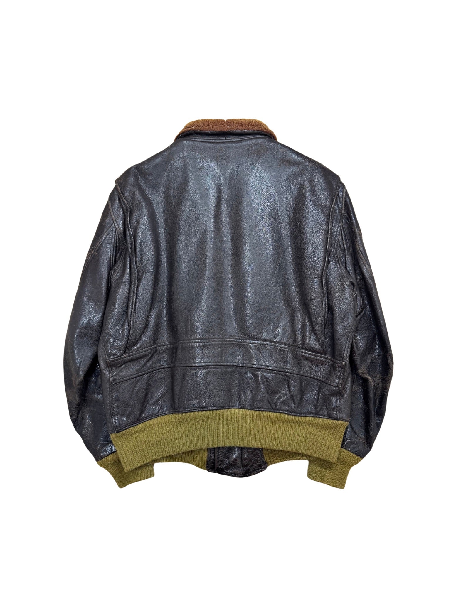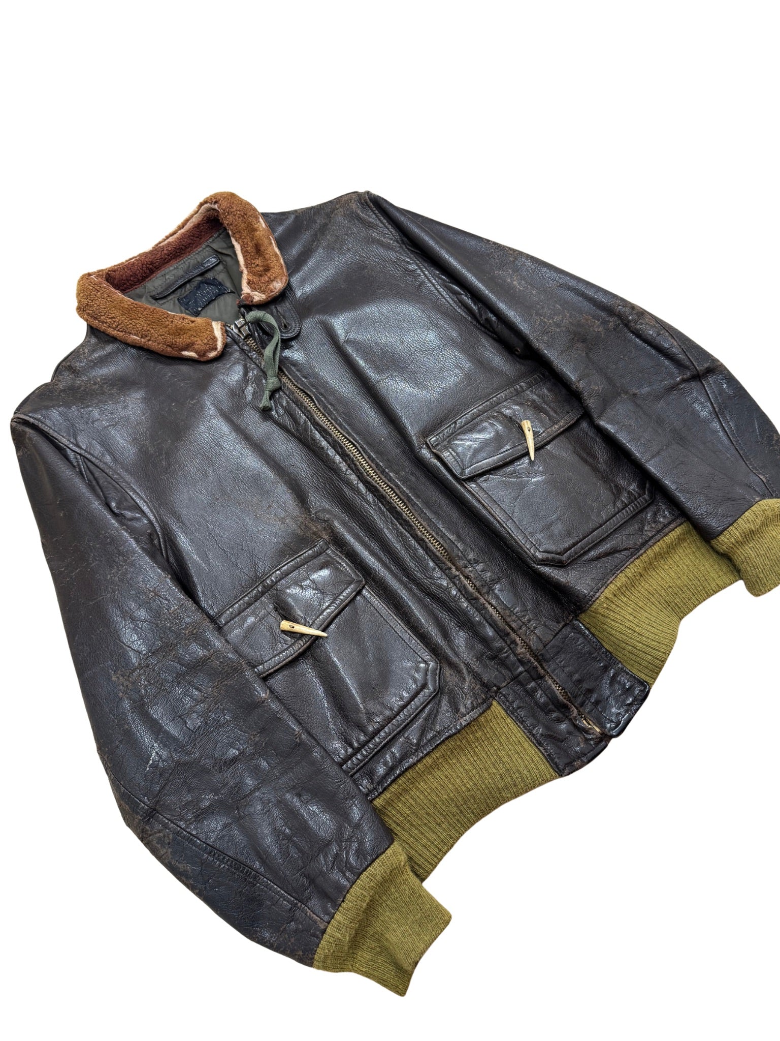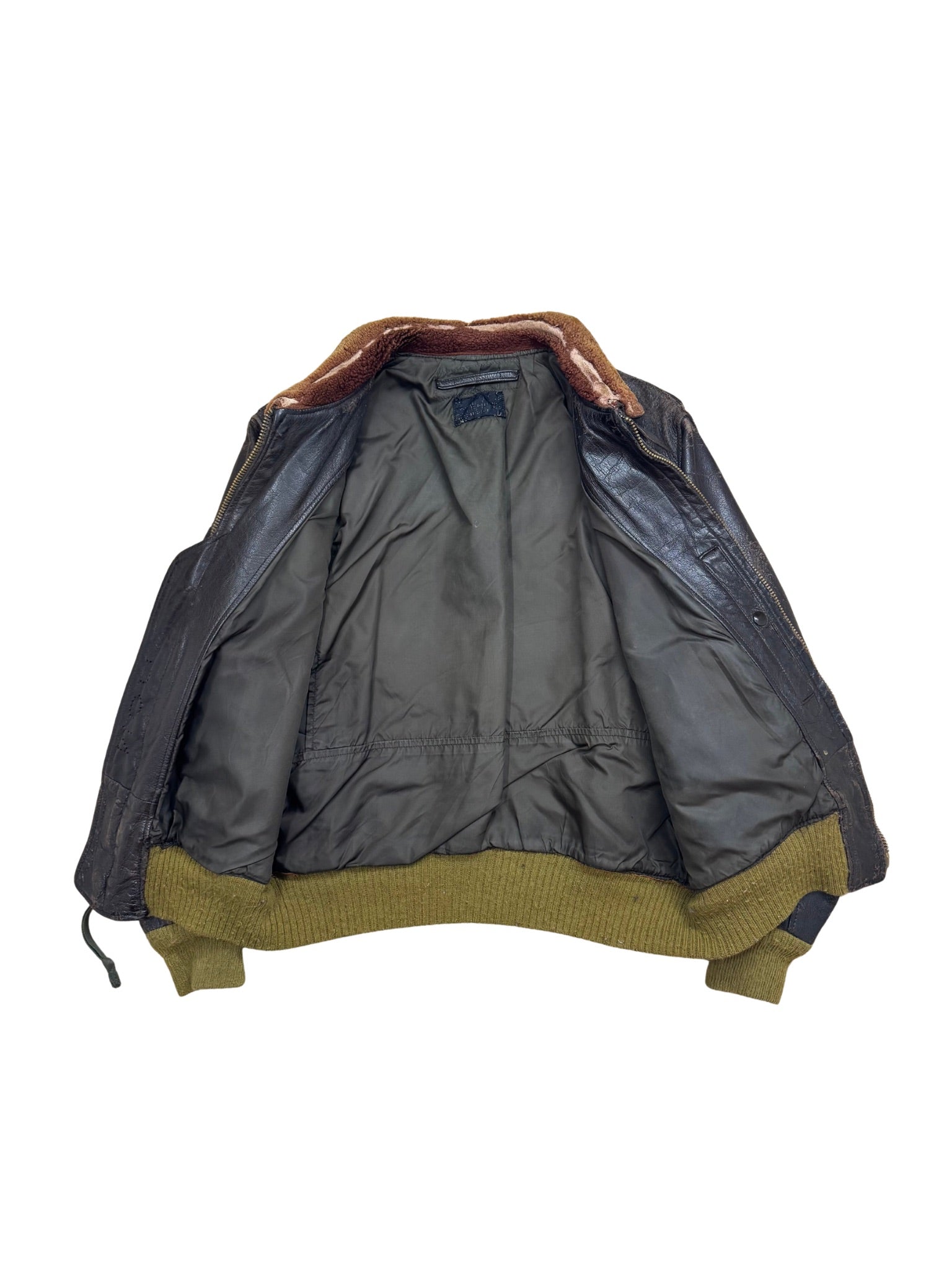 Eine originale G-1 Flight Jacket mit echtem Einsatzcharakter. Schweres, dunkelbraunes Leder, markante Gebrauchsspuren und ein abgetragener Shearling-Kragen. Die Fronttaschen mit Horn-Zip-Pulls, robuste Rippbündchen in Oliv und ein authentisches Innenfutter machen das Stück zu einem Zeitzeugen – roh, ungefiltert, unverfälscht.