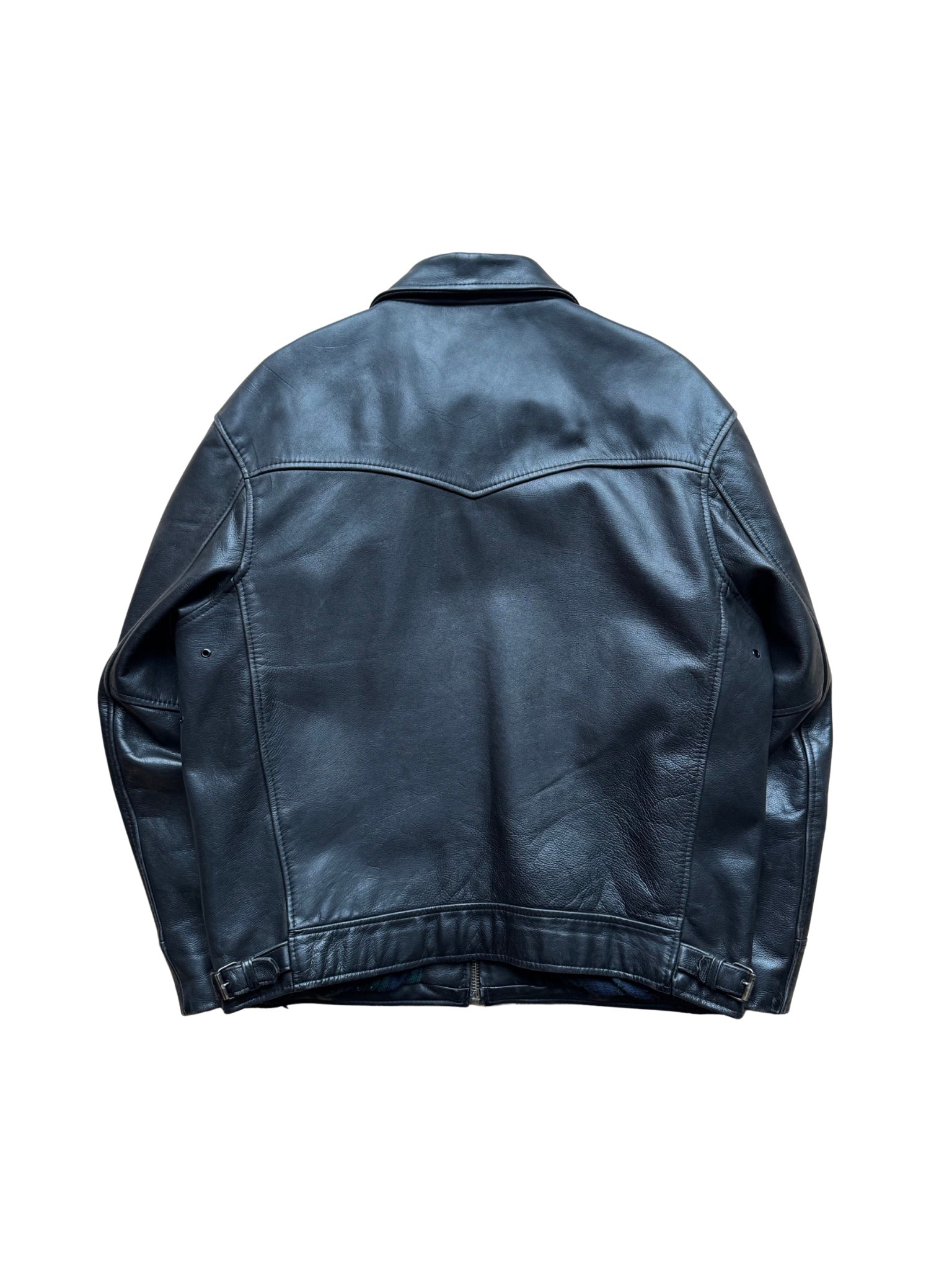 Klassische britische Lederjacke von AMI London. Schweres, glattes Rindsleder in tiefem Schwarz, sauber gealtert, mit natürlichem Glanz. Reduzierter Frontaufbau mit Brustzip, zwei Seitentaschen und durchgehendem Metallreissverschluss. Innen ein tartanartiges Wollfutter – funktional, warm, unaufgeregt.